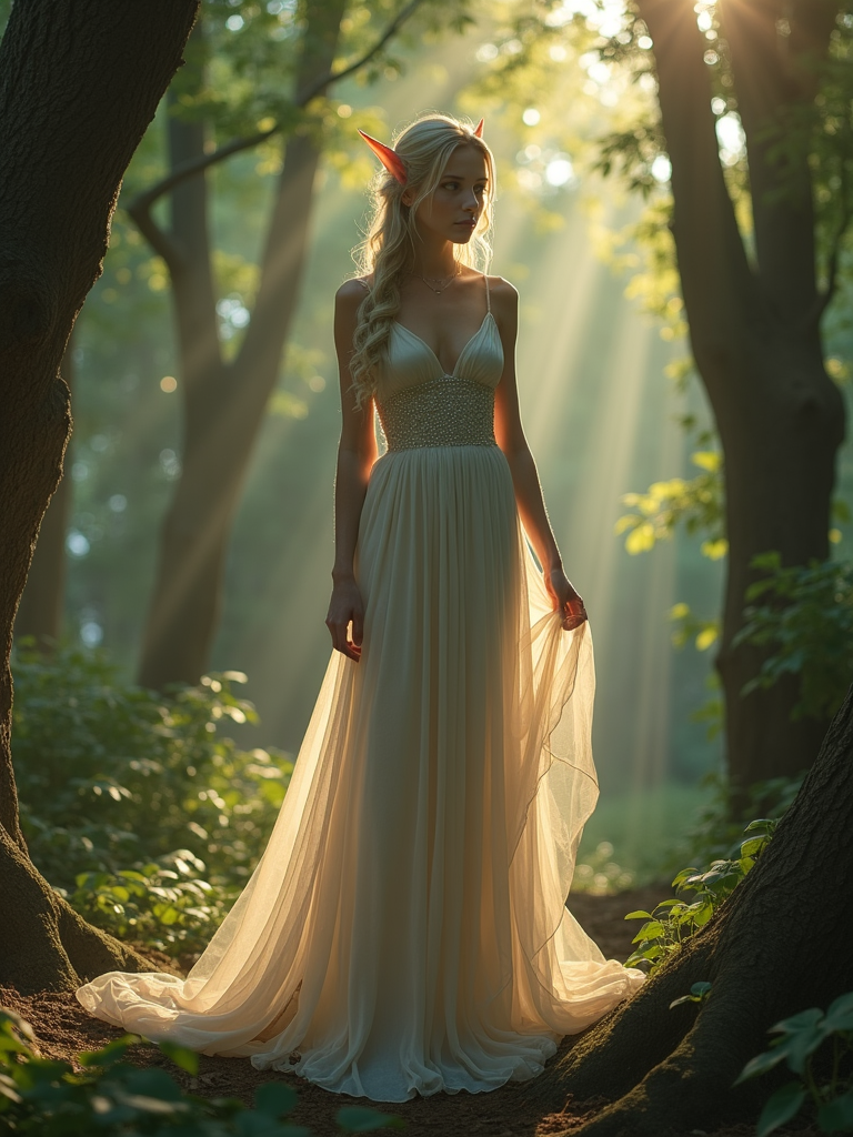 model as an elegant elf princess with pointed ears wearing a flowing ethereal gown in an enchanted forest with glowing magical light filtering through ancient trees