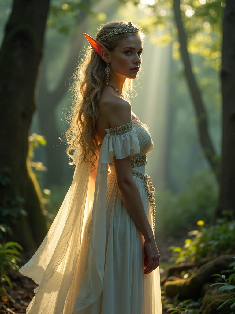 model as an elegant elf princess with pointed ears wearing a flowing ethereal gown in an enchanted forest with glowing magical light filtering through ancient trees