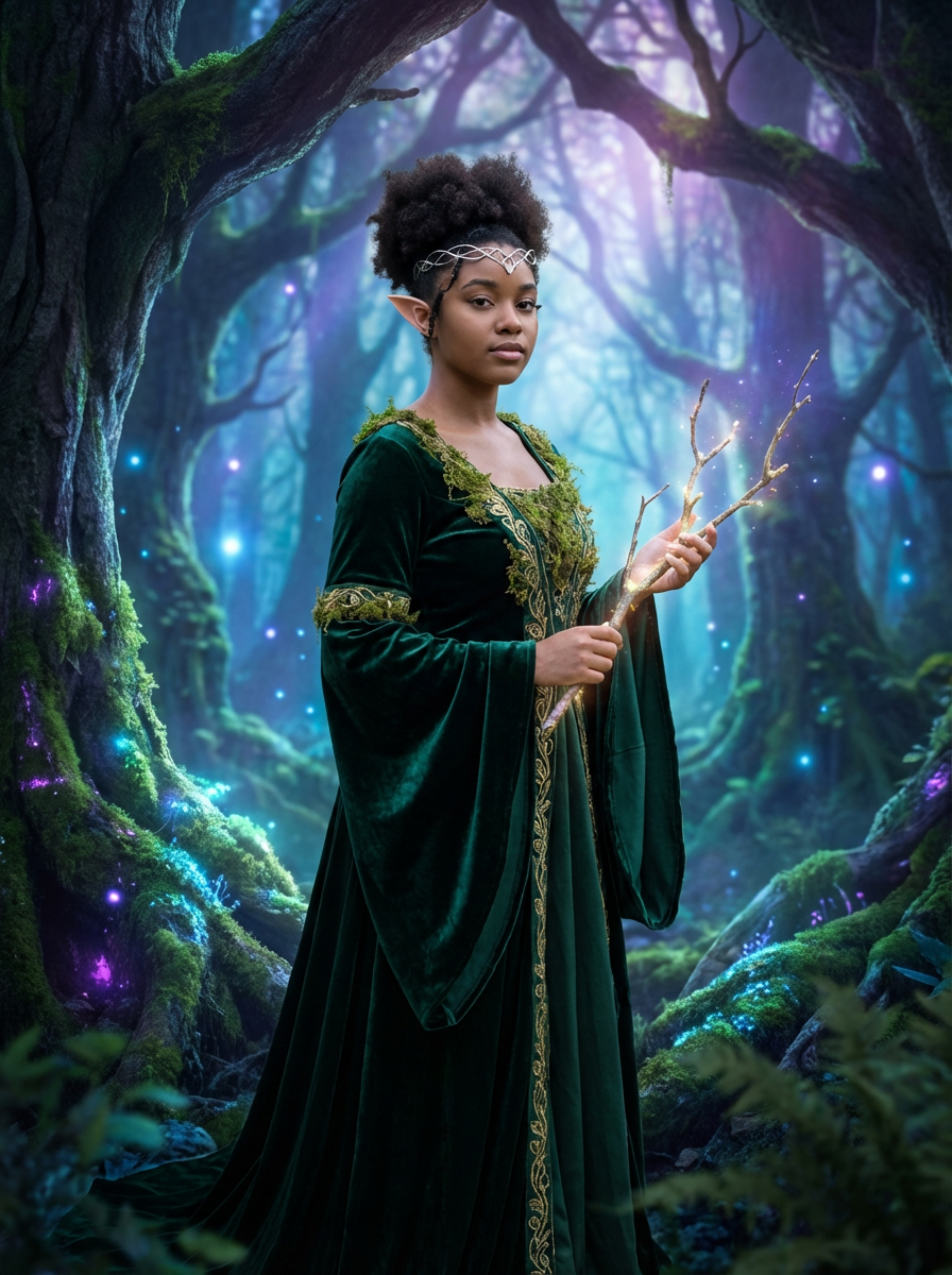 model as an elegant elf princess with pointed ears wearing a flowing ethereal gown in an enchanted forest with glowing magical light filtering through ancient trees