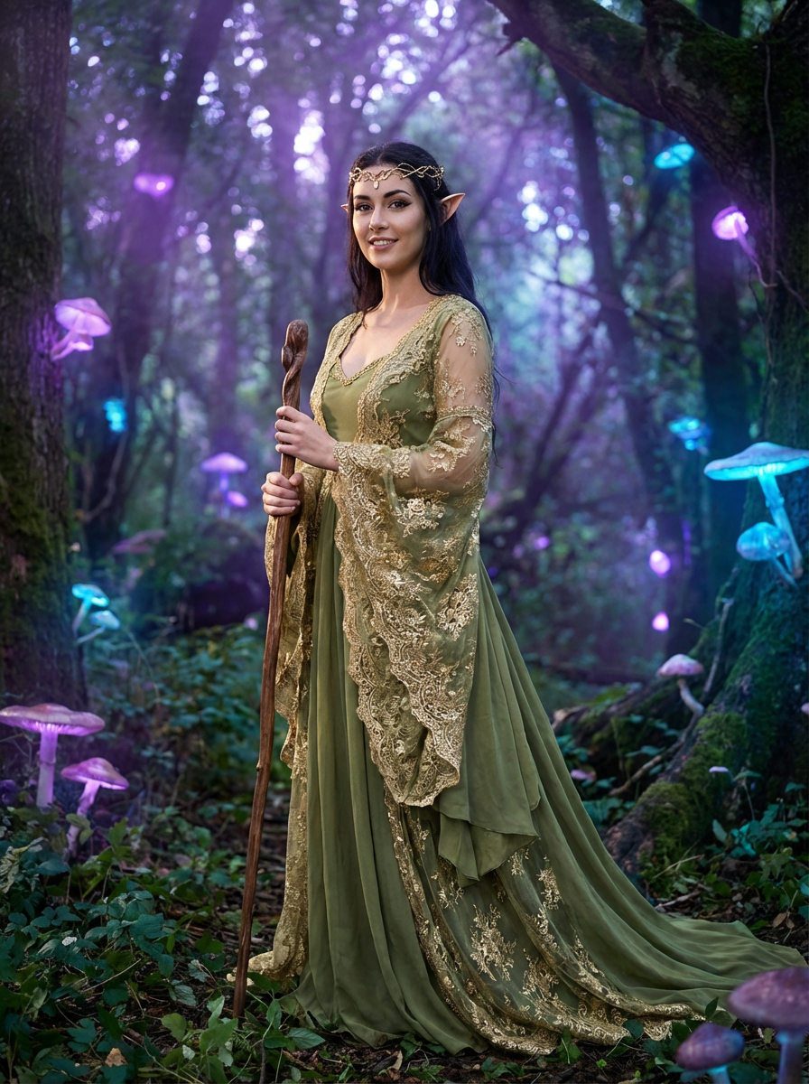 model as an elegant elf princess with pointed ears wearing a flowing ethereal gown in an enchanted forest with glowing magical light filtering through ancient trees