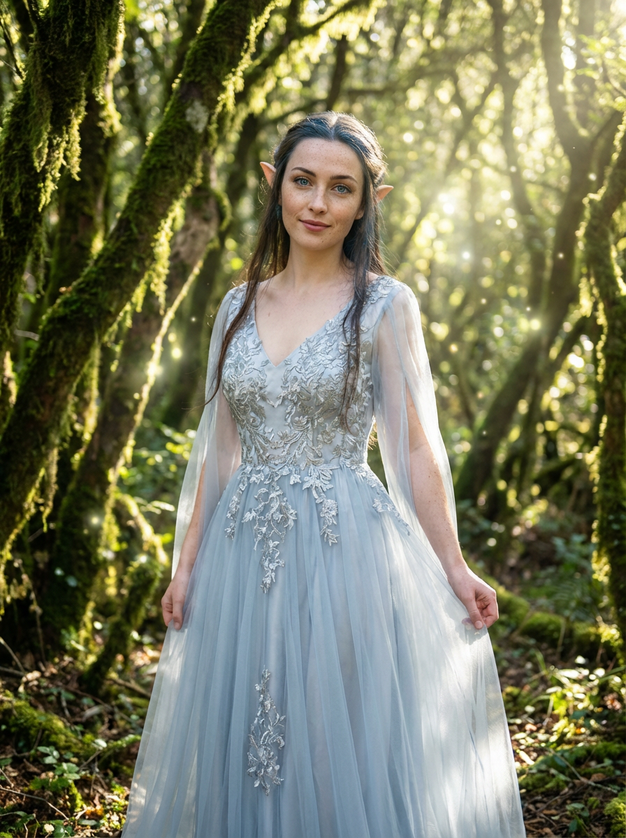 model as an elegant elf princess with pointed ears wearing a flowing ethereal gown in an enchanted forest with glowing magical light filtering through ancient trees