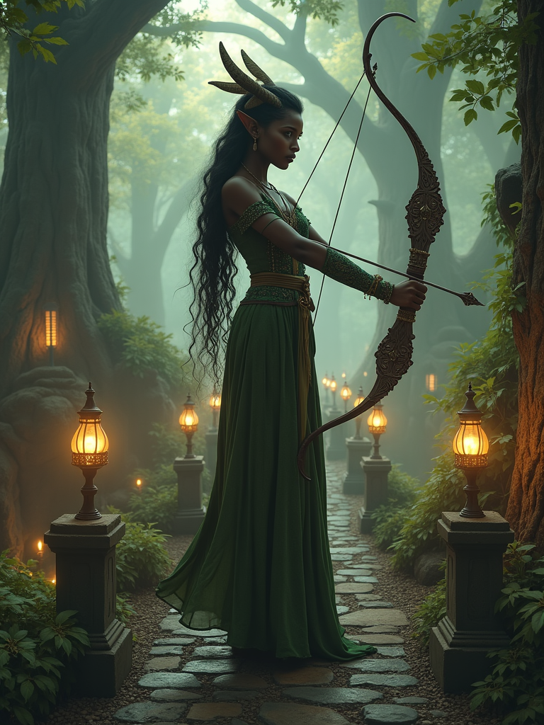 model as an elvish archer princess with ornate bow standing on ancient stone bridges in an elvish tree city with glowing lanterns and magical architecture