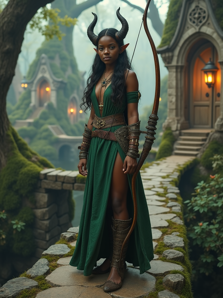model as an elvish archer princess with ornate bow standing on ancient stone bridges in an elvish tree city with glowing lanterns and magical architecture