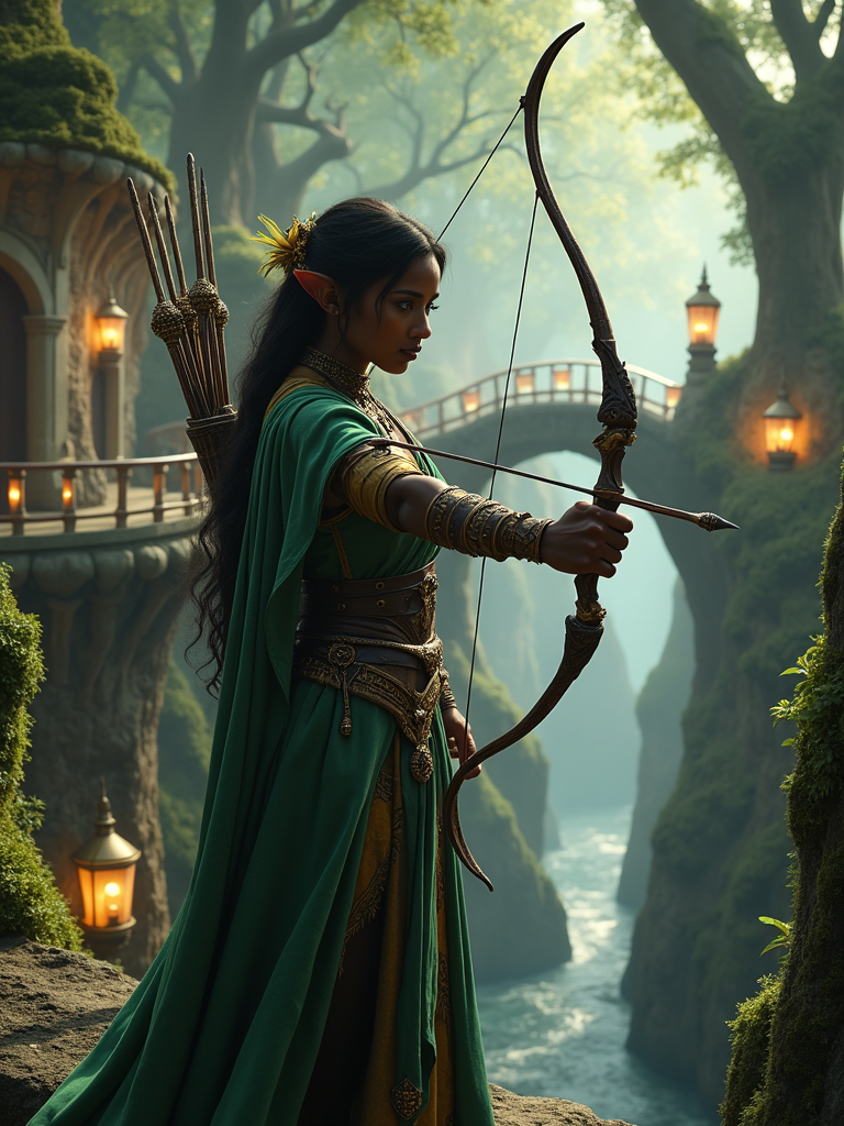model as an elvish archer princess with ornate bow standing on ancient stone bridges in an elvish tree city with glowing lanterns and magical architecture