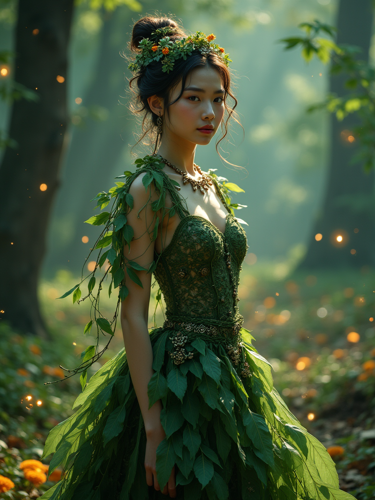 model as an enchanted forest guardian wearing a dress made of leaves and vines surrounded by glowing fireflies and magical creatures in a mystical woodland clearing
