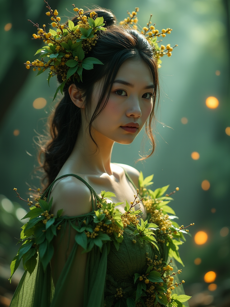 model as an enchanted forest guardian wearing a dress made of leaves and vines surrounded by glowing fireflies and magical creatures in a mystical woodland clearing