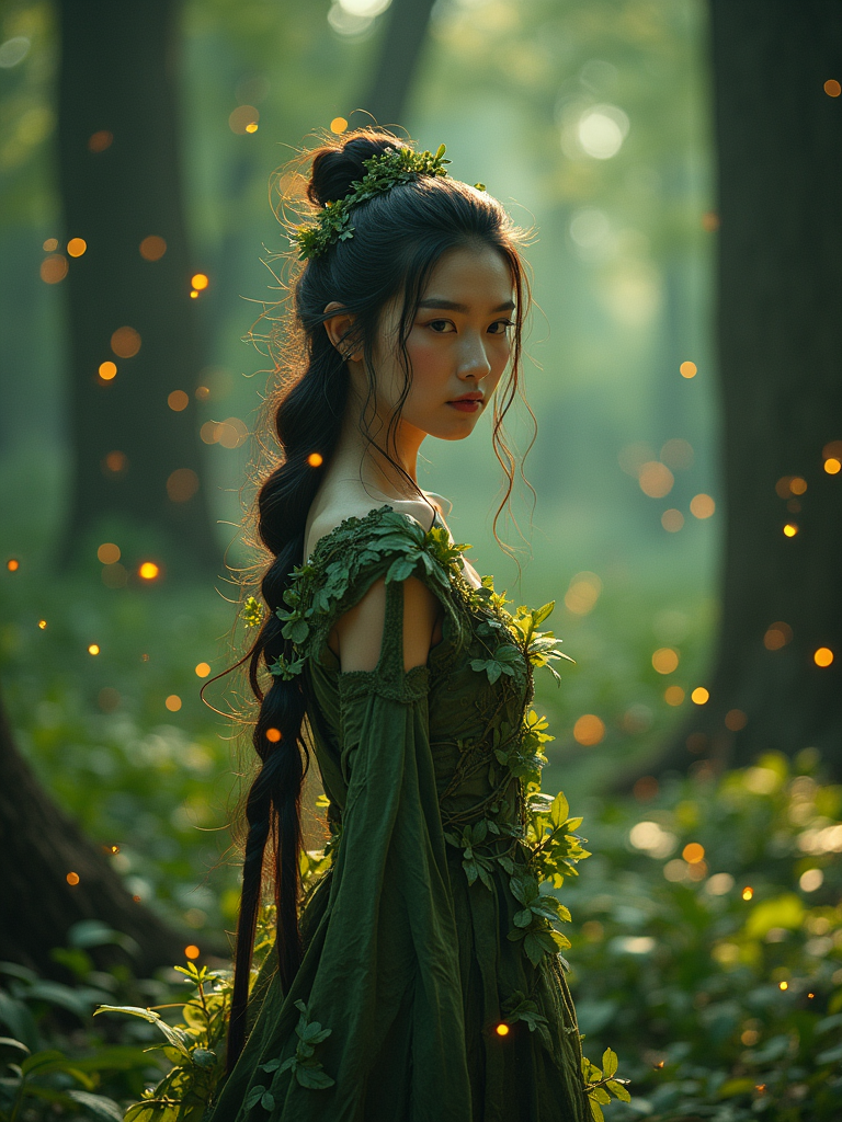 model as an enchanted forest guardian wearing a dress made of leaves and vines surrounded by glowing fireflies and magical creatures in a mystical woodland clearing