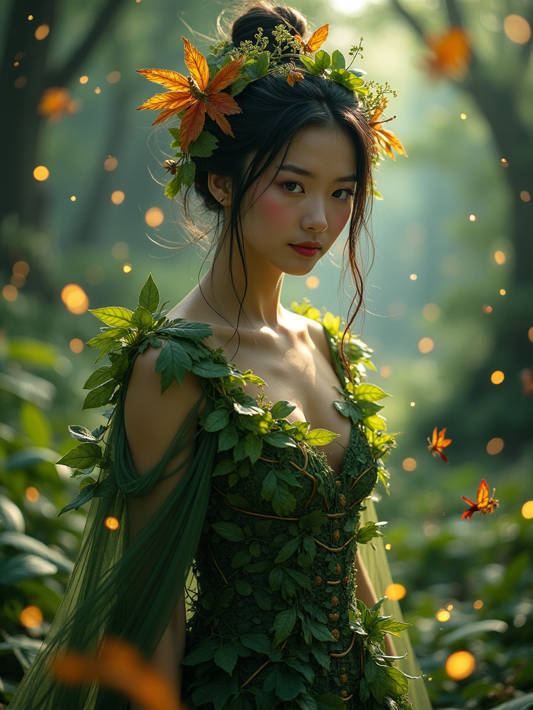 model as an enchanted forest guardian wearing a dress made of leaves and vines surrounded by glowing fireflies and magical creatures in a mystical woodland clearing