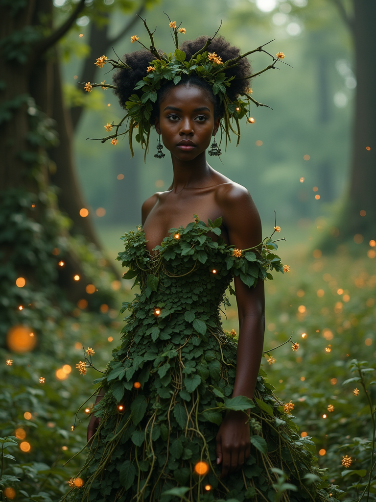 model as an enchanted forest guardian wearing a dress made of leaves and vines surrounded by glowing fireflies and magical creatures in a mystical woodland clearing