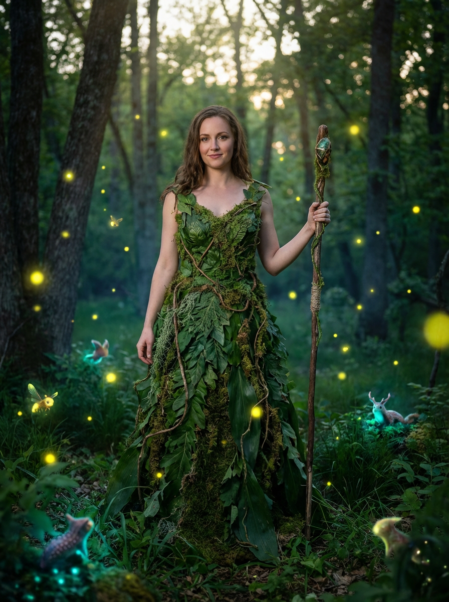 model as an enchanted forest guardian wearing a dress made of leaves and vines surrounded by glowing fireflies and magical creatures in a mystical woodland clearing