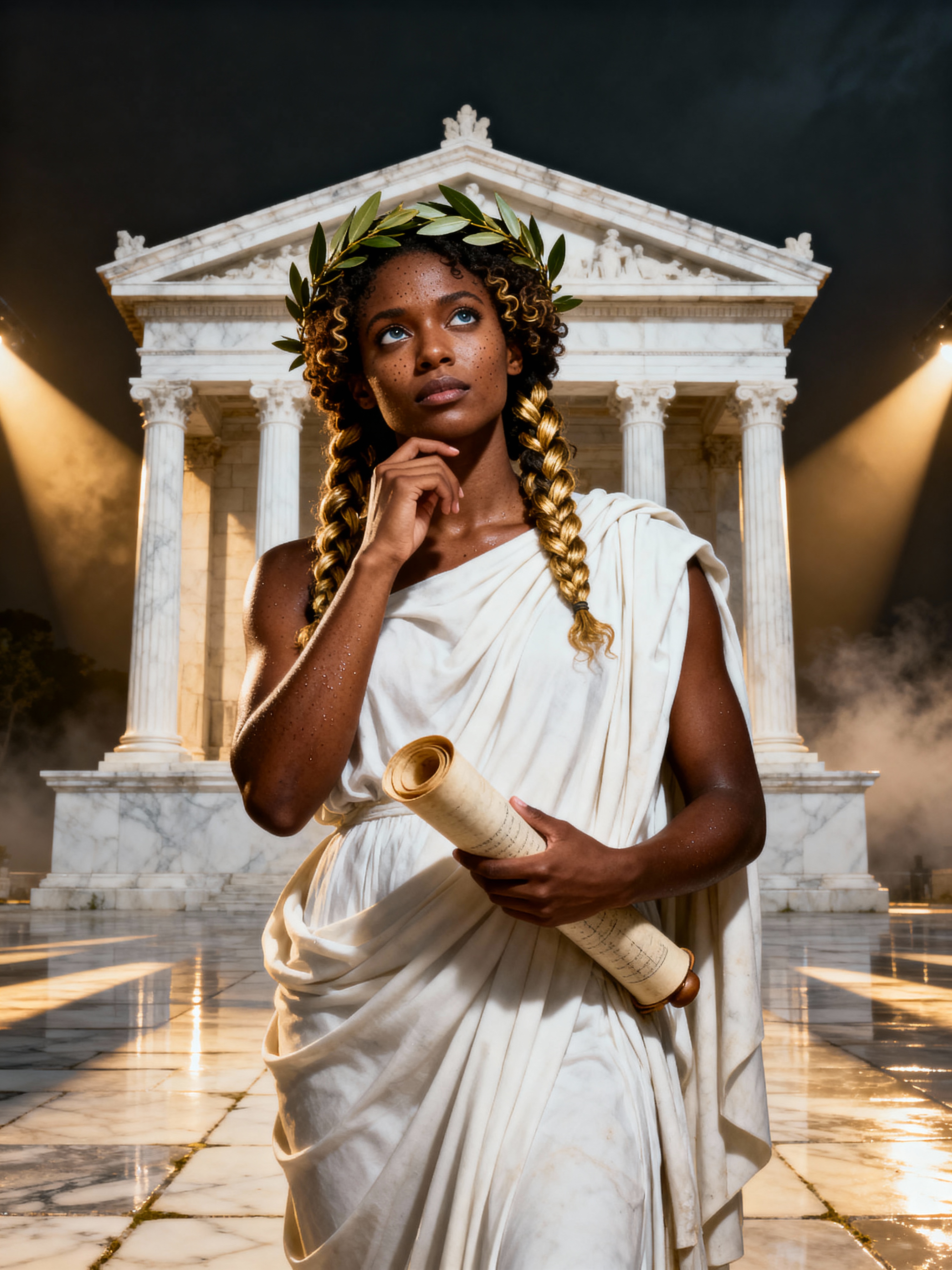 model as Ancient Greek philosopher in 500 B.C., Ancient Roman white clean new temple in background