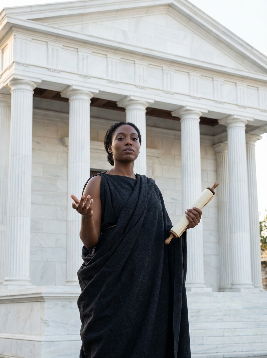 model as Ancient Greek philosopher in 500 B.C., Ancient Roman white clean new temple in background