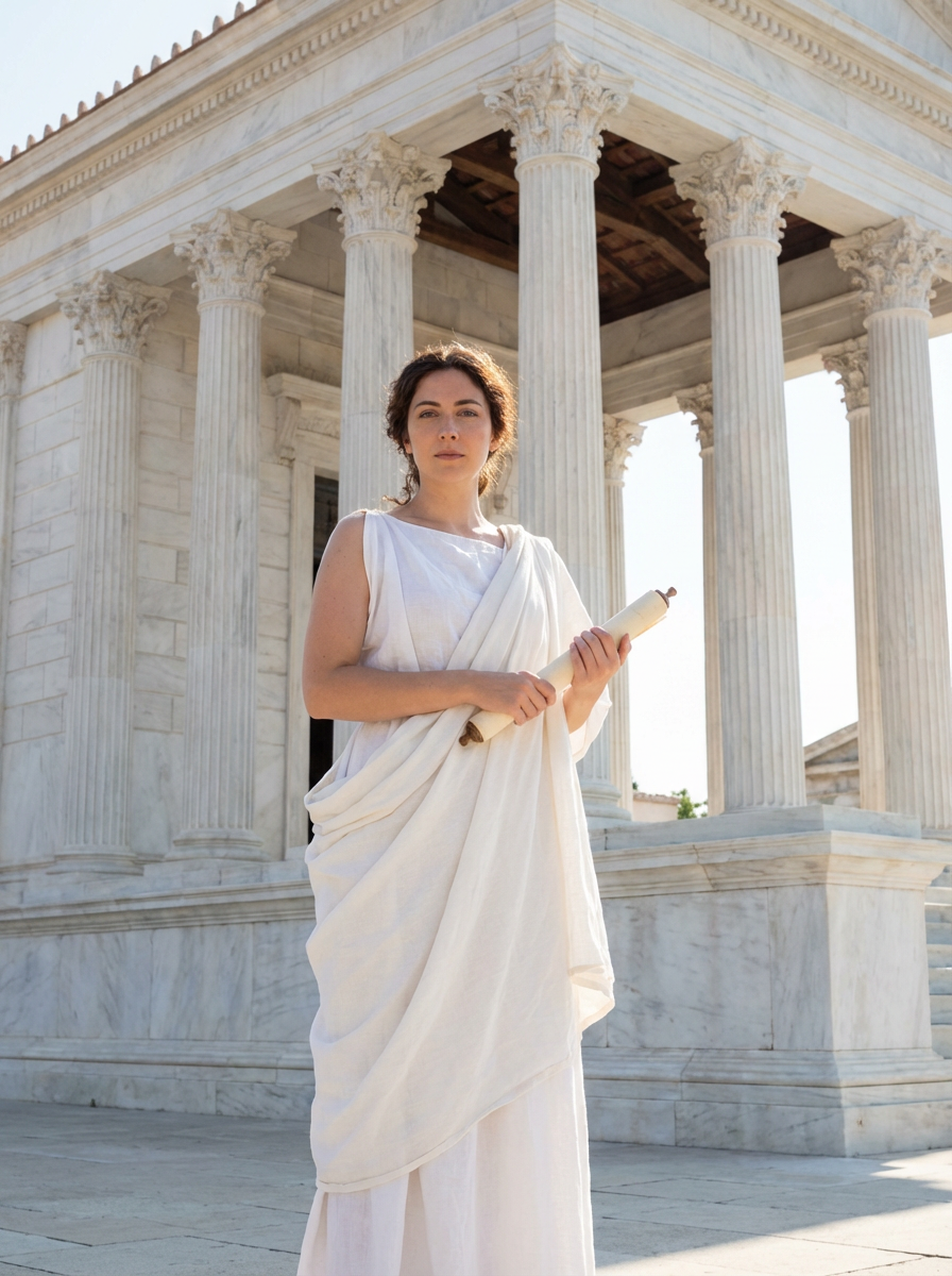 model as Ancient Greek philosopher in 500 B.C., Ancient Roman white clean new temple in background