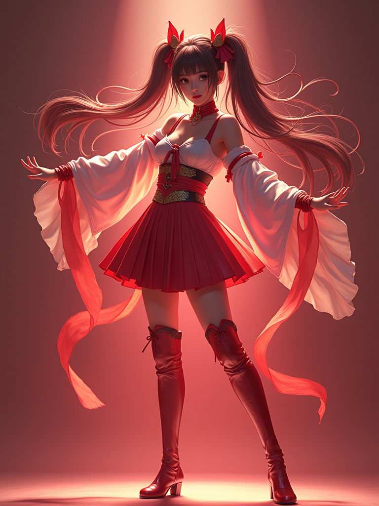 model as anime hero, studio lights, wearing a magical girl outfit with flowing ribbons and knee-high boots , dramatic lighting, posing in a power stance