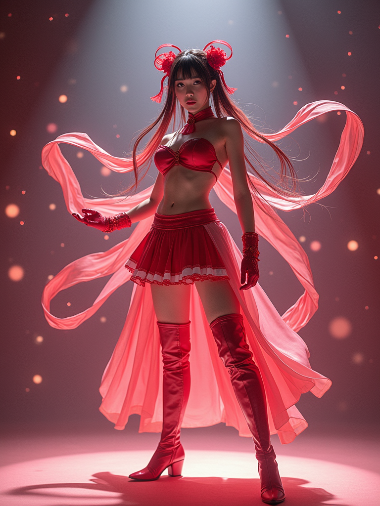 model as anime hero, studio lights, wearing a magical girl outfit with flowing ribbons and knee-high boots , dramatic lighting, posing in a power stance