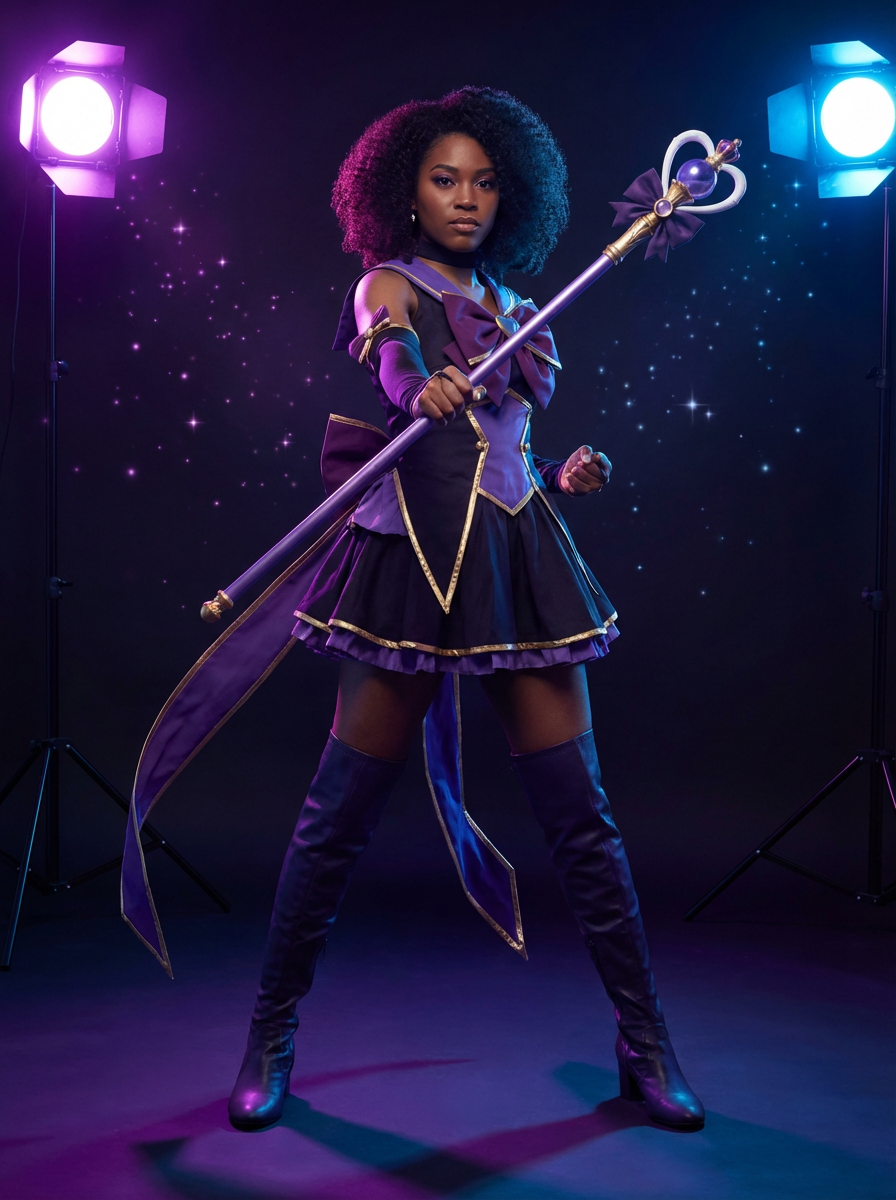 model as anime hero, studio lights, wearing a magical girl outfit with flowing ribbons and knee-high boots , dramatic lighting, posing in a power stance