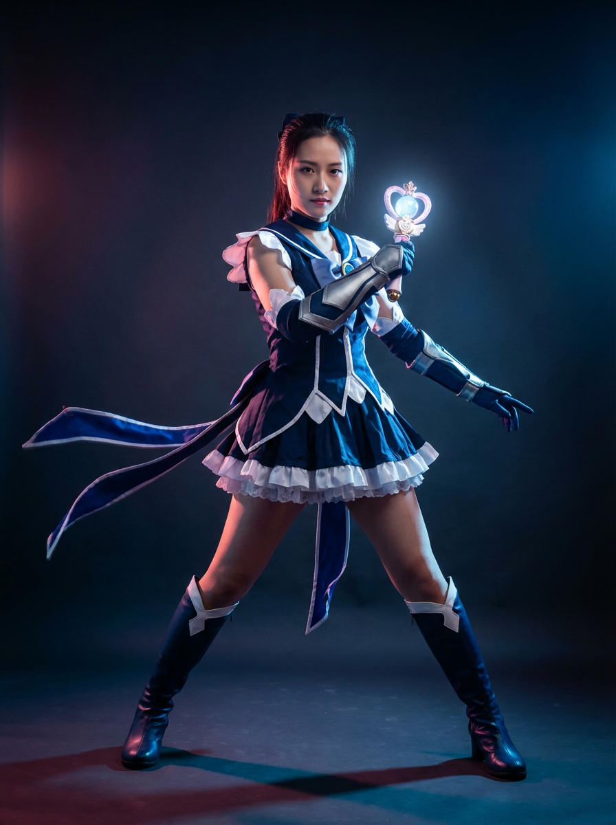 model as anime hero, studio lights, wearing a magical girl outfit with flowing ribbons and knee-high boots , dramatic lighting, posing in a power stance