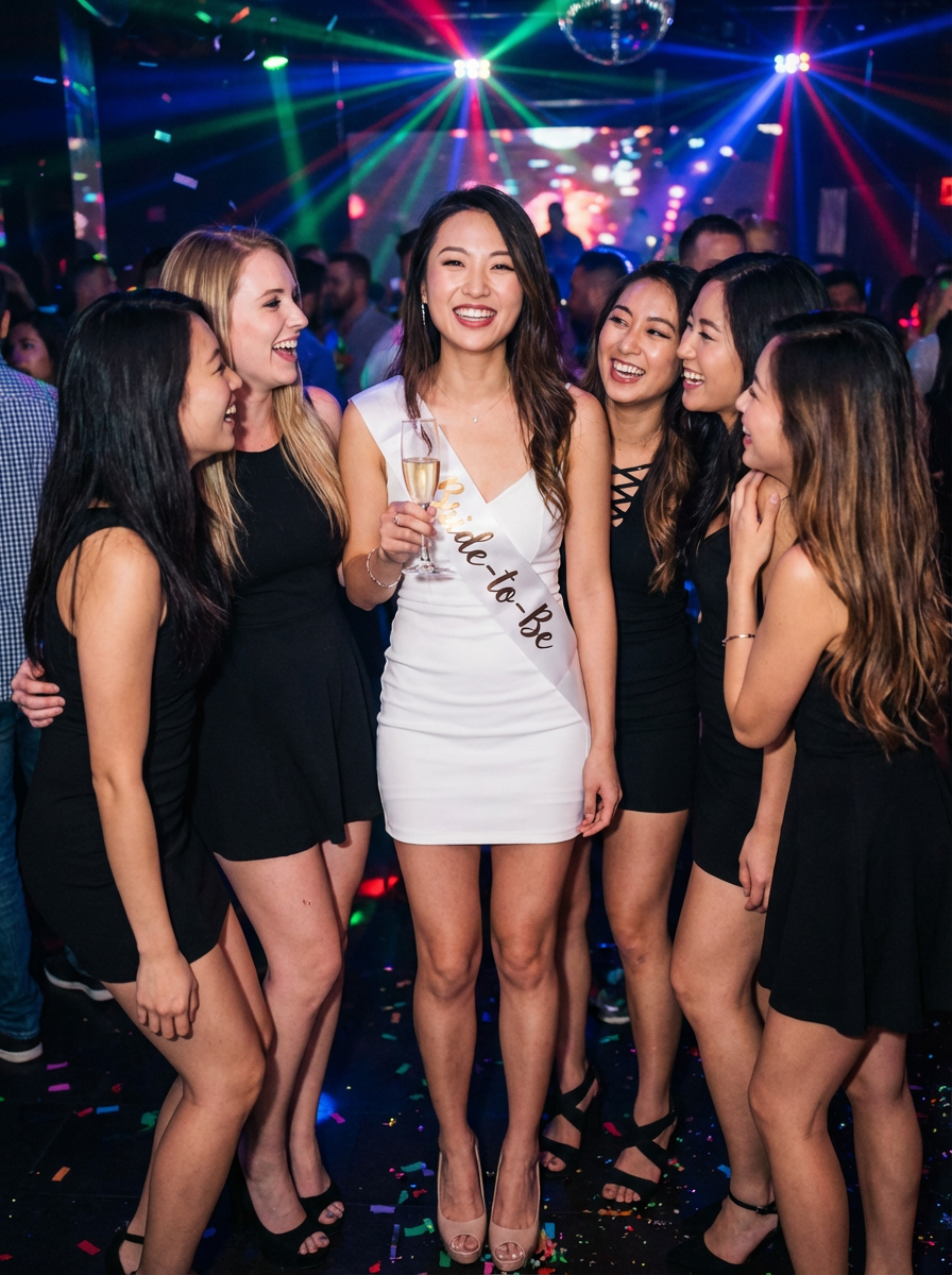 model as bride-to-be at bachelorette party, white outfit, bride sash, surrounded by friends in matching outfits, club or venue setting