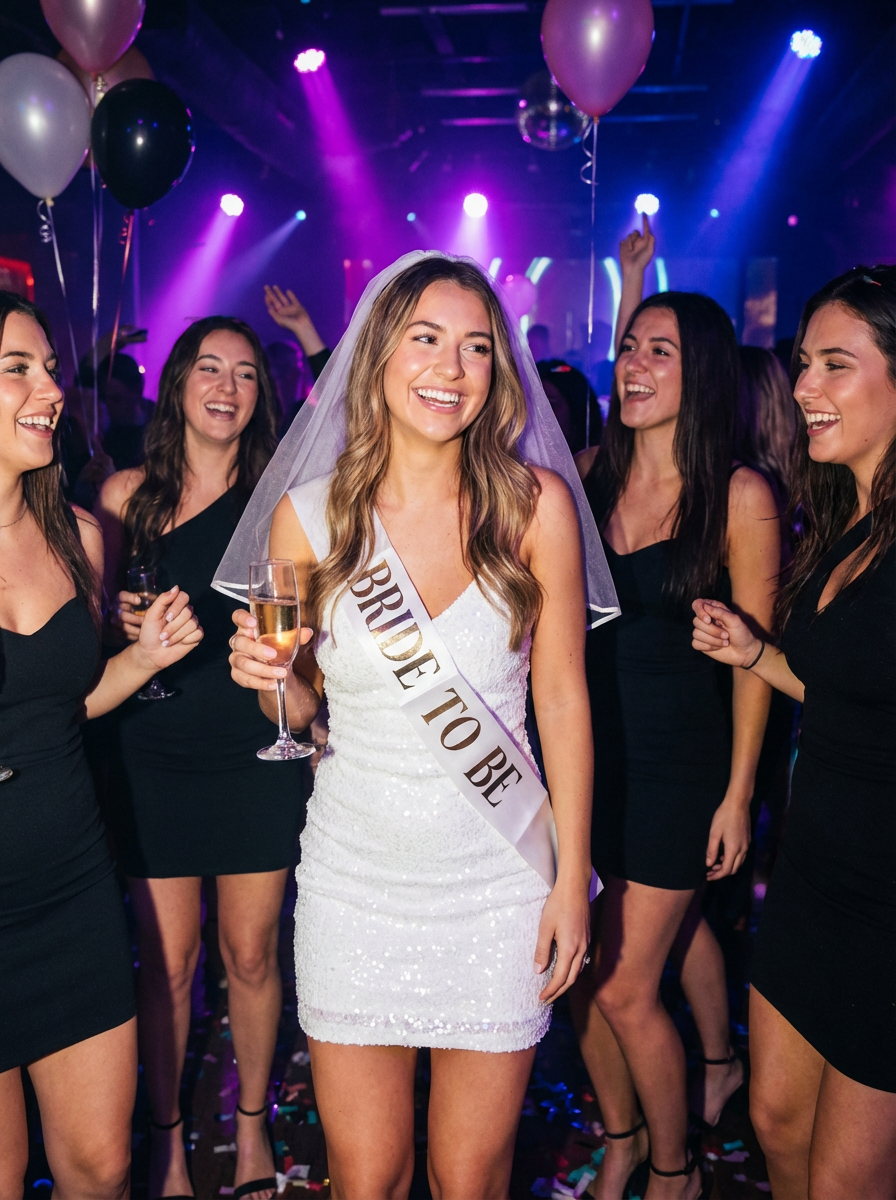 model as bride-to-be at bachelorette party, white outfit, bride sash, surrounded by friends in matching outfits, club or venue setting