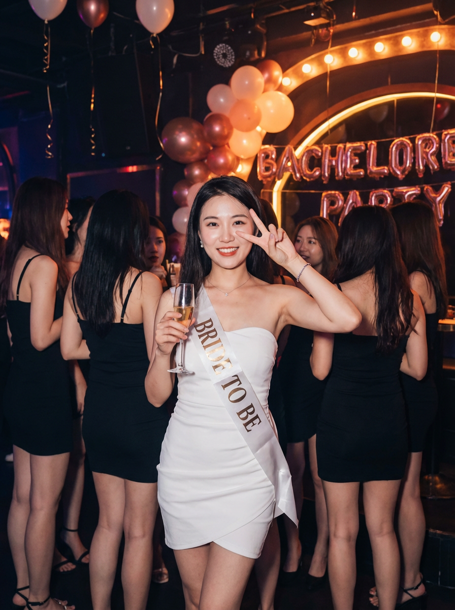 model as bride-to-be at bachelorette party, white outfit, bride sash, surrounded by friends in matching outfits, club or venue setting