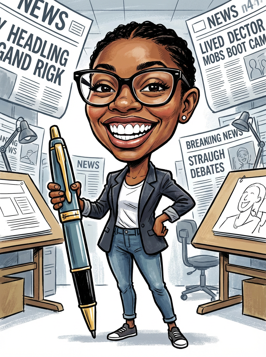 model as caricature, exaggerated features, humorous portrait, editorial cartoon style