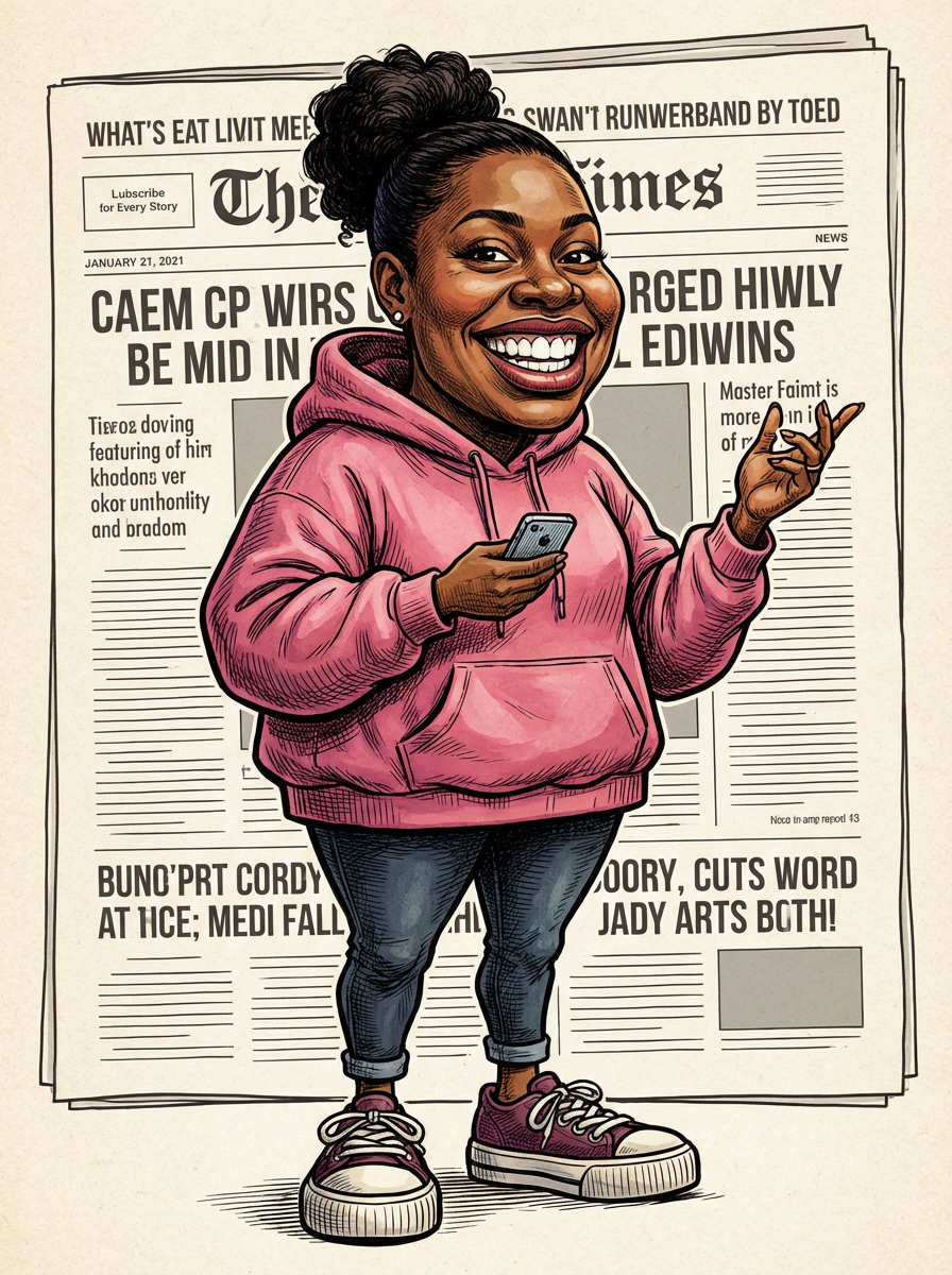 model as caricature, exaggerated features, humorous portrait, editorial cartoon style
