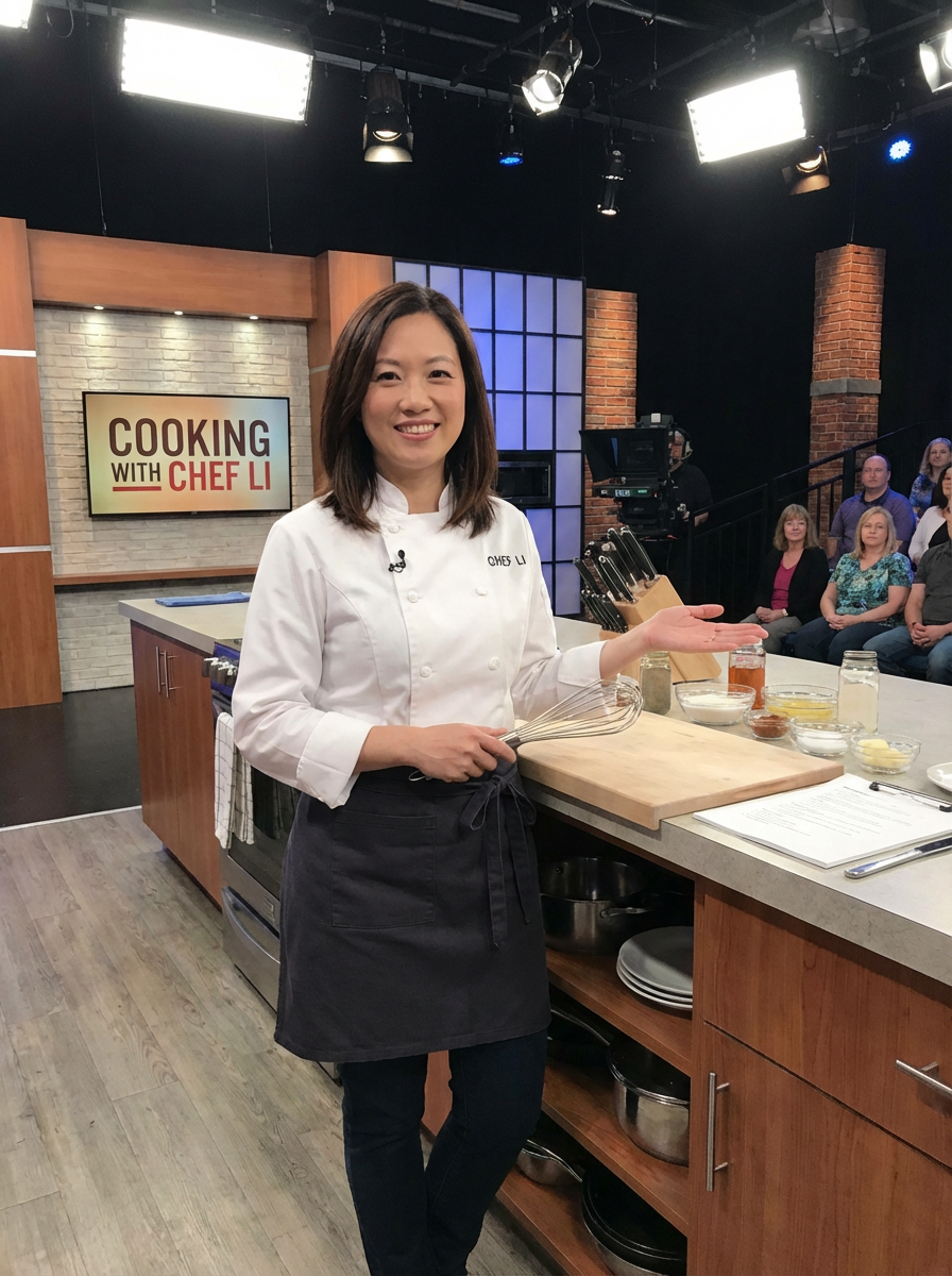 model as celebrity chef style, charismatic expression, stylish chef attire, TV kitchen set aesthetic