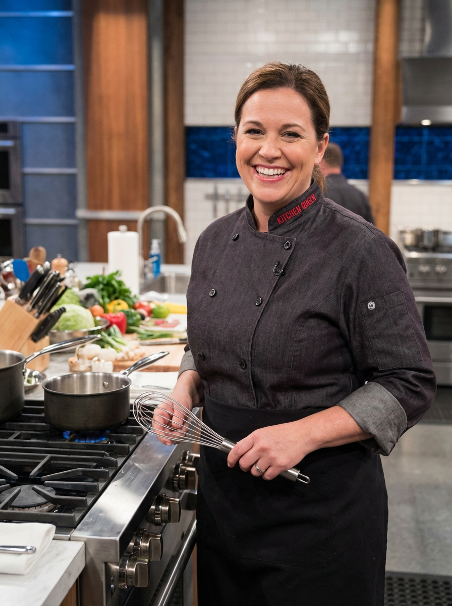 model as celebrity chef style, charismatic expression, stylish chef attire, TV kitchen set aesthetic