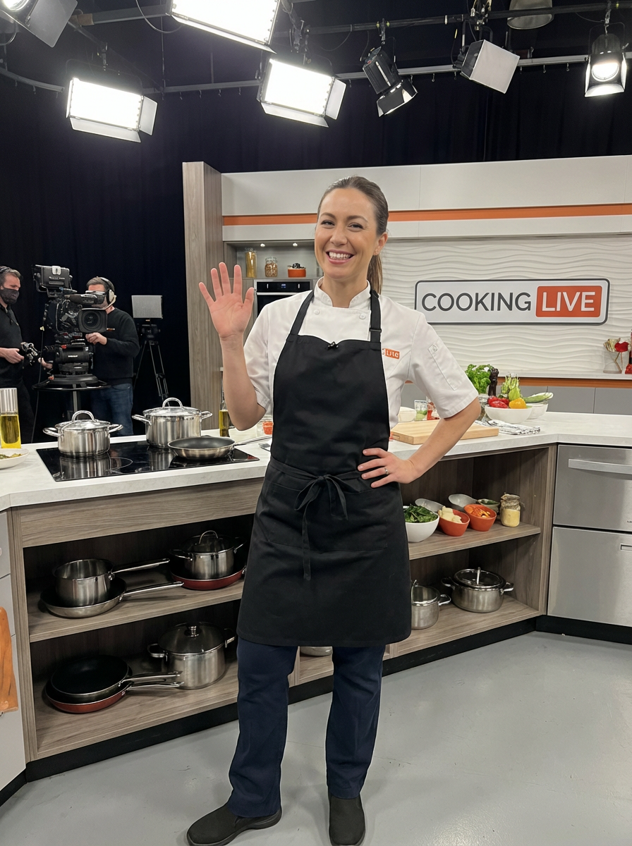 model as celebrity chef style, charismatic expression, stylish chef attire, TV kitchen set aesthetic