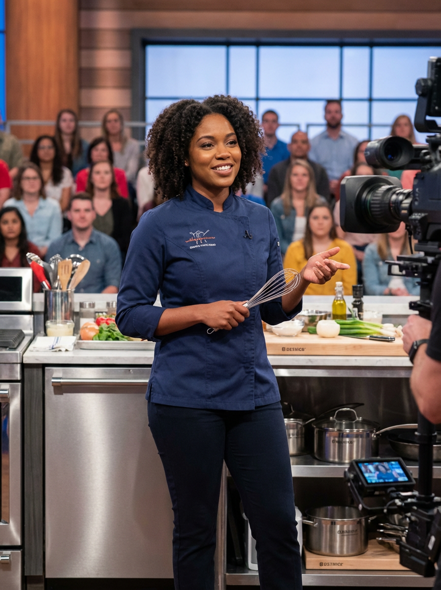 model as celebrity chef style, charismatic expression, stylish chef attire, TV kitchen set aesthetic