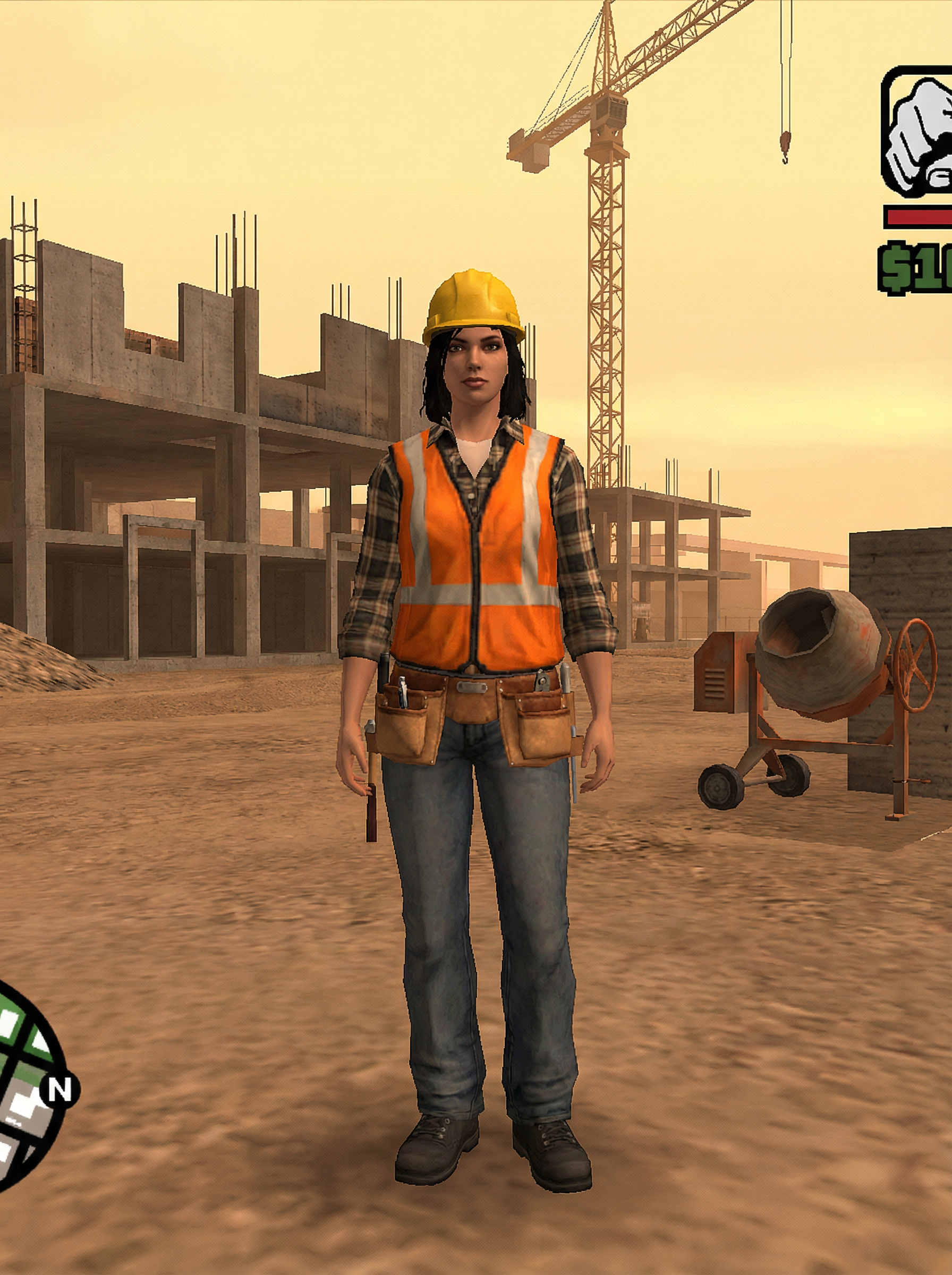 model as character in Grand Theft Auto: San Andreas video game (DO NOT CREATE ILLUSTRATION), at construction site, wearing hard hat, safety vest, work boots, tool belt , entire image is in the style of GTA San Andreas (DO NOT MAKE IT A PHOTO)