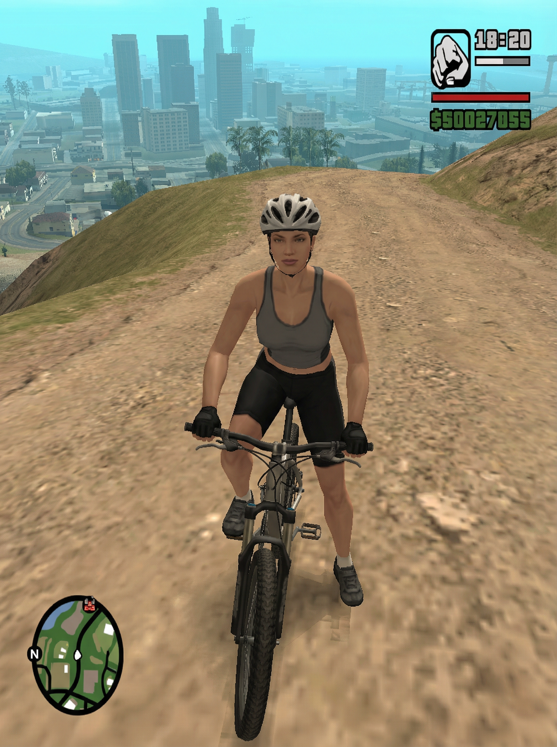 model as character in Grand Theft Auto: San Andreas video game (DO NOT CREATE ILLUSTRATION), on mountain bike trail, wearing athletic top, bike shorts, helmet, gloves , entire image is in the style of GTA San Andreas (DO NOT MAKE IT A PHOTO)