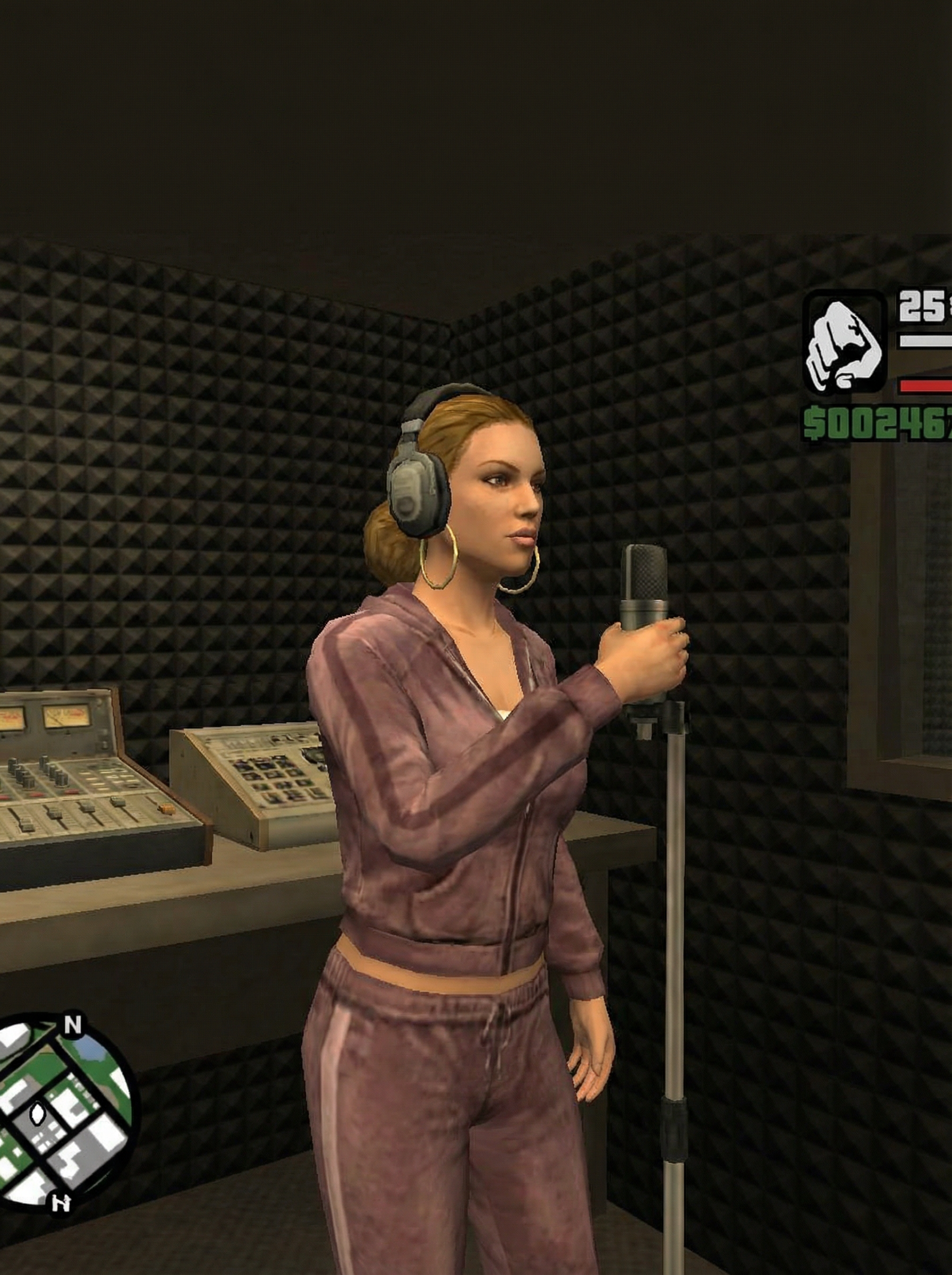 model as character in Grand Theft Auto: San Andreas video game (DO NOT CREATE ILLUSTRATION), in recording studio, wearing trendy outfit, headphones, jewelry , entire image is in the style of GTA San Andreas (DO NOT MAKE IT A PHOTO)