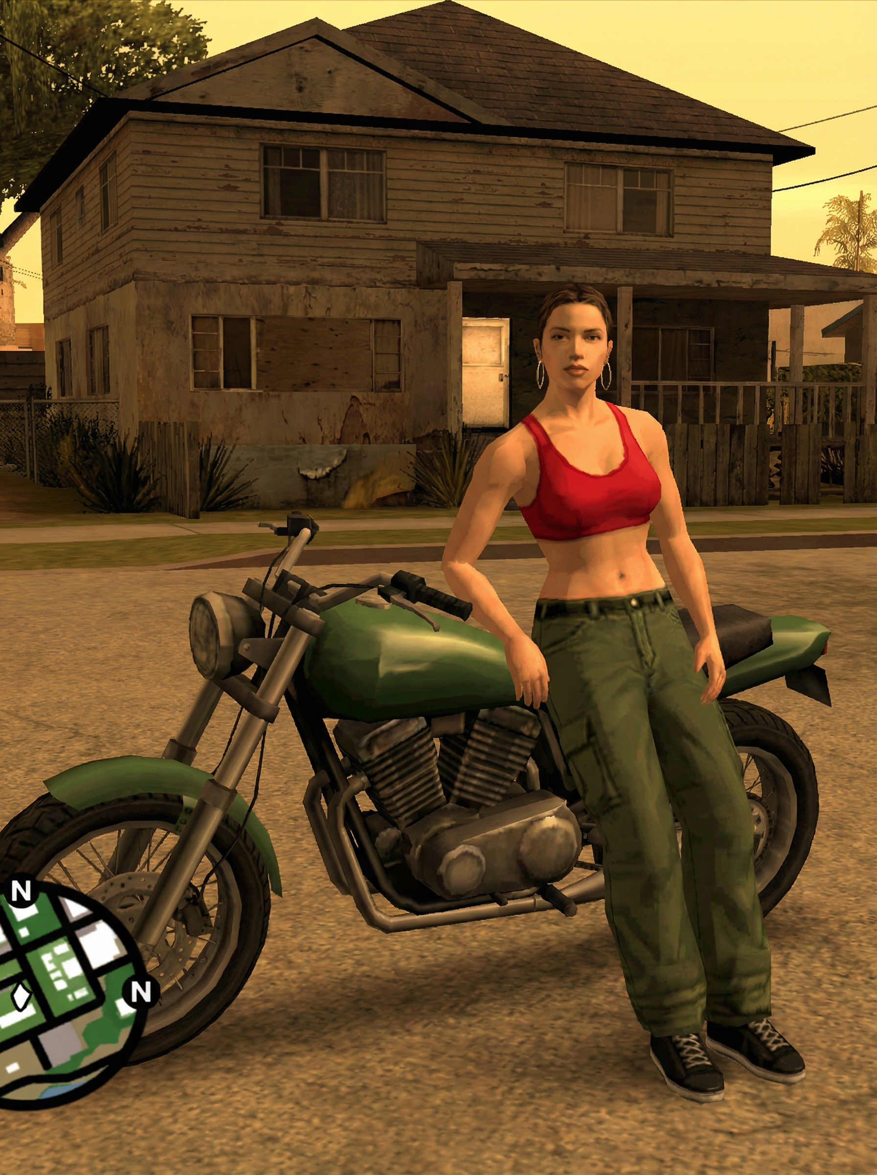 model as character in Grand Theft Auto: San Andreas video game (DO NOT CREATE ILLUSTRATION), leaning against motorcycle outside Grove Street house, wearing sports bra, cargo pants, sneakers, hoop earrings , entire image is in the style of GTA San Andreas (DO NOT MAKE IT A PHOTO)