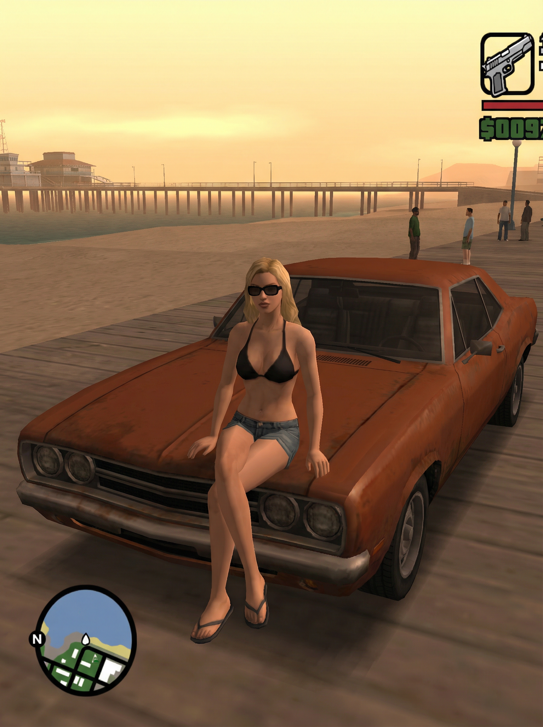 model as character in Grand Theft Auto: San Andreas video game (DO NOT CREATE ILLUSTRATION), sitting on hood of muscle car at beach pier, wearing bikini top, denim shorts, flip-flops, sunglasses , entire image is in the style of GTA San Andreas (DO NOT MAKE IT A PHOTO)