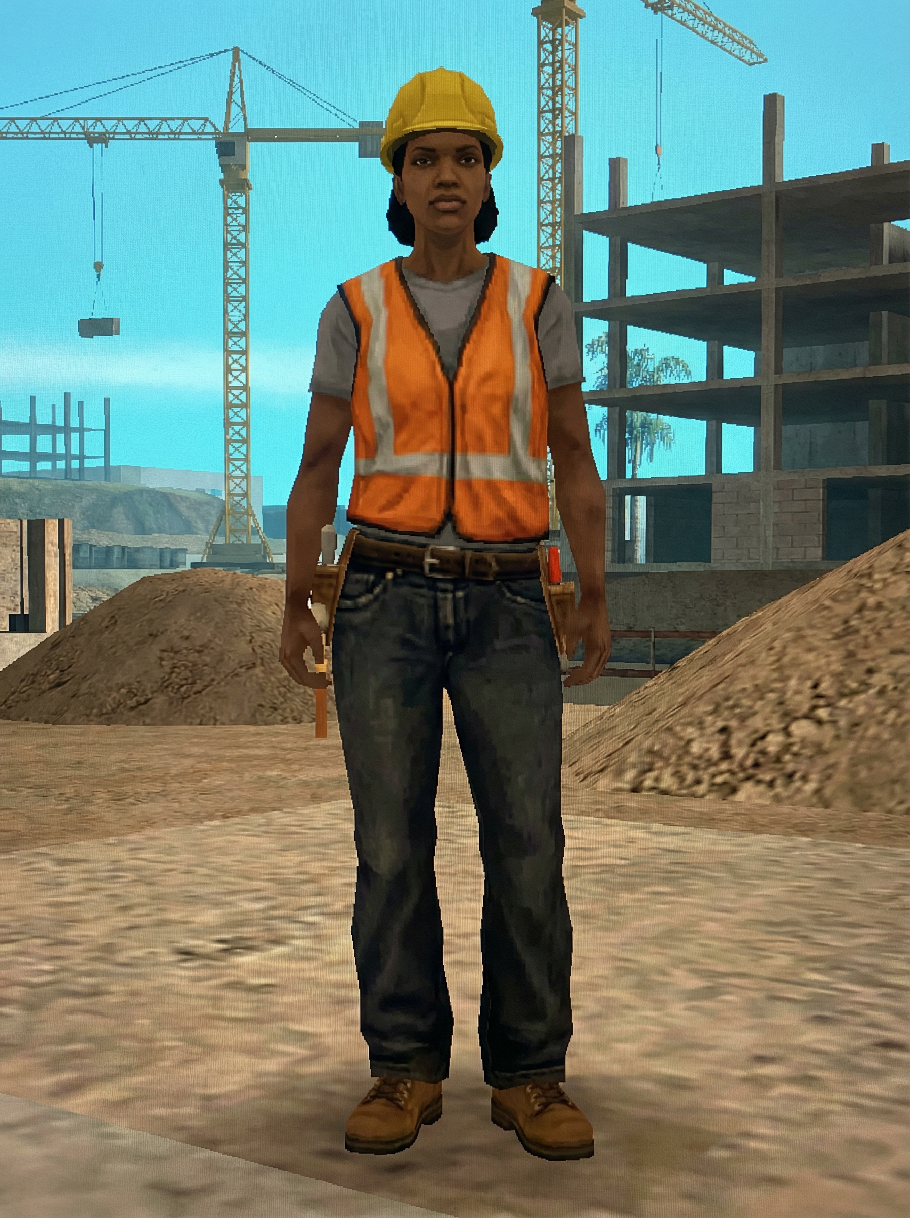 model as character in Grand Theft Auto: San Andreas video game (DO NOT CREATE ILLUSTRATION), at construction site, wearing hard hat, safety vest, work boots, tool belt , entire image is in the style of GTA San Andreas (DO NOT MAKE IT A PHOTO)