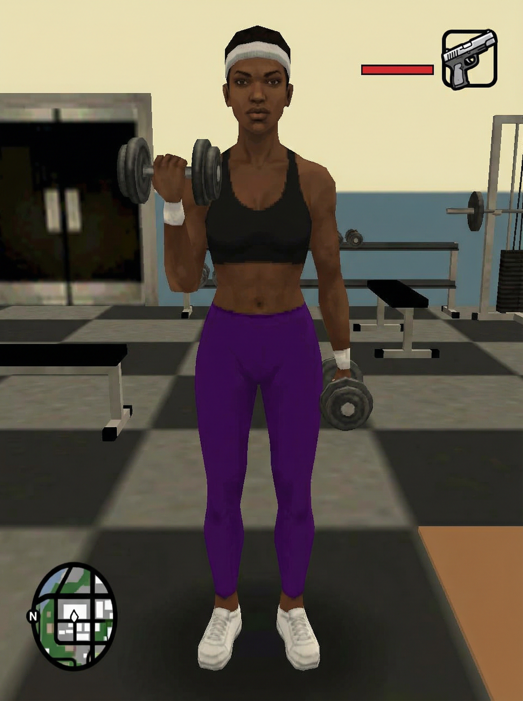 model as character in Grand Theft Auto: San Andreas video game (DO NOT CREATE ILLUSTRATION), in gym working out, wearing sports bra, leggings, sneakers, sweatband , entire image is in the style of GTA San Andreas (DO NOT MAKE IT A PHOTO)