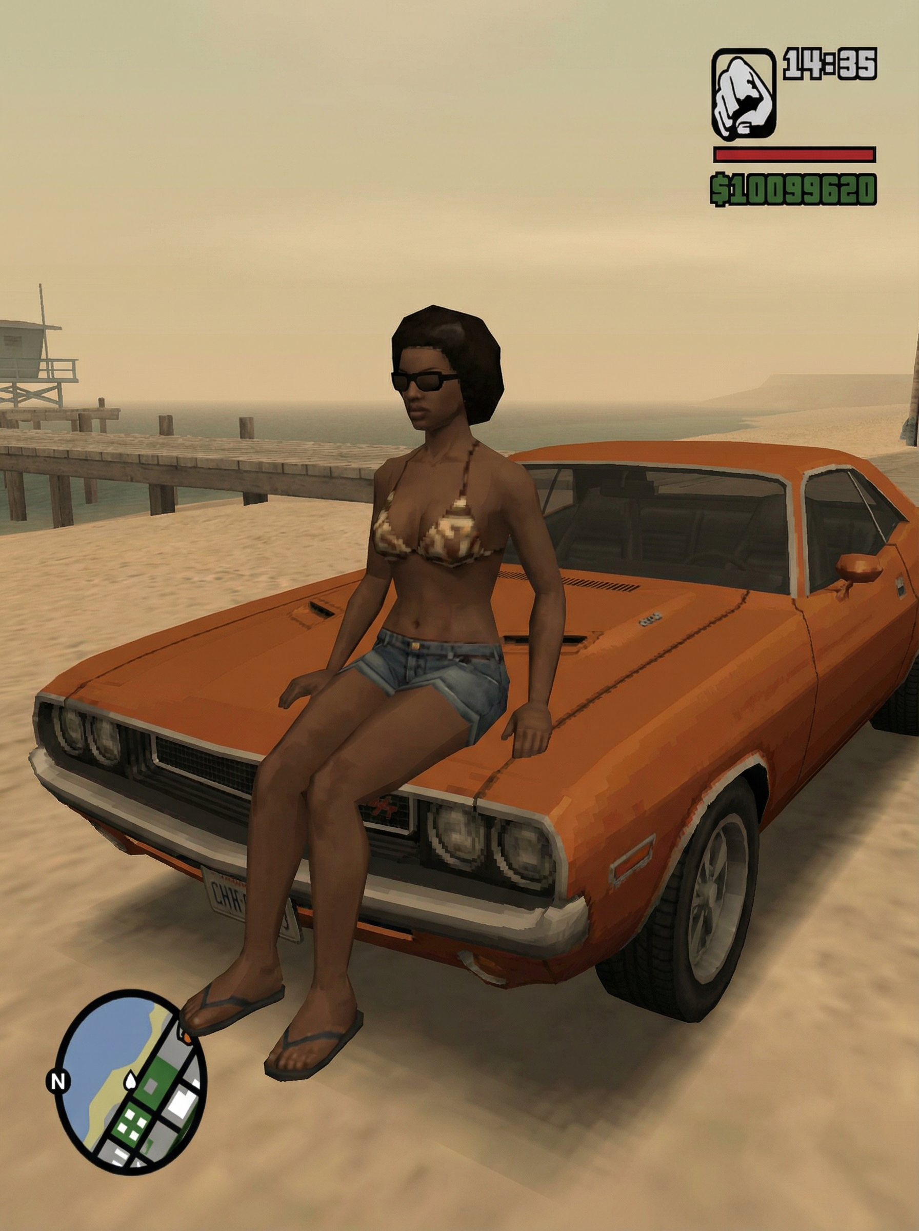 model as character in Grand Theft Auto: San Andreas video game (DO NOT CREATE ILLUSTRATION), sitting on hood of muscle car at beach pier, wearing bikini top, denim shorts, flip-flops, sunglasses , entire image is in the style of GTA San Andreas (DO NOT MAKE IT A PHOTO)
