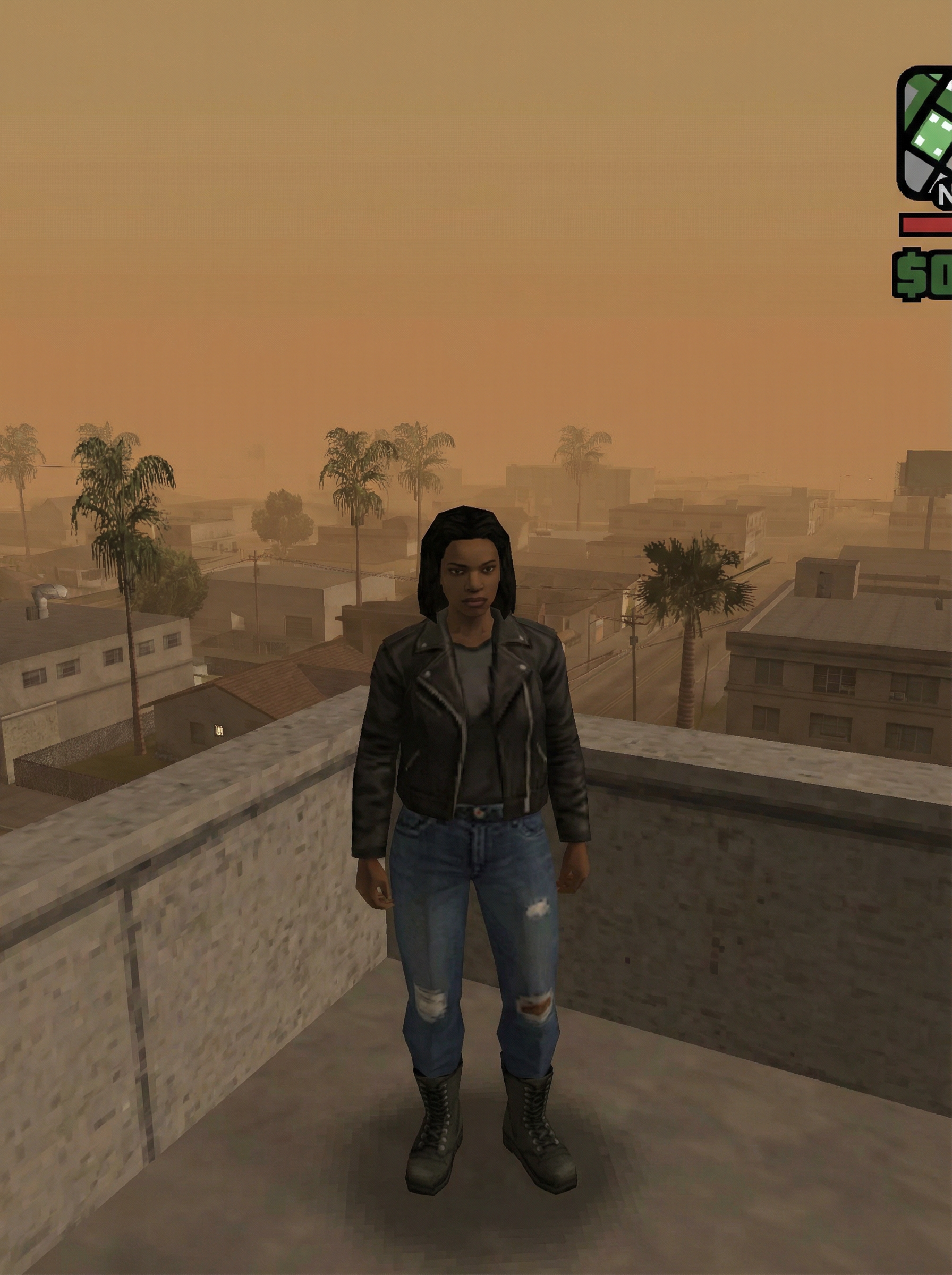 model as character in Grand Theft Auto: San Andreas video game (DO NOT CREATE ILLUSTRATION), standing on rooftop overlooking city skyline, wearing leather jacket, ripped jeans, combat boots , entire image is in the style of GTA San Andreas (DO NOT MAKE IT A PHOTO)