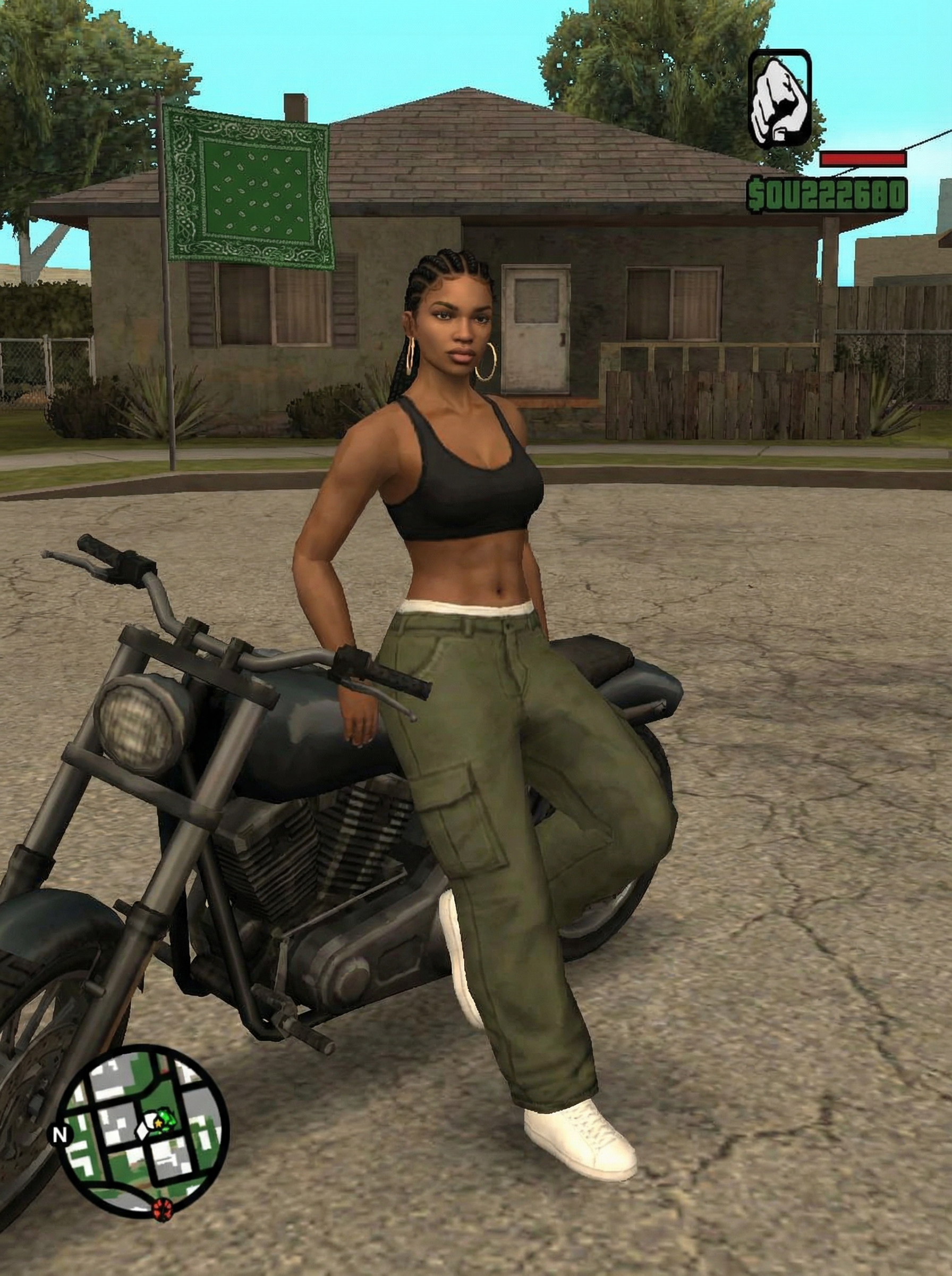 model as character in Grand Theft Auto: San Andreas video game (DO NOT CREATE ILLUSTRATION), leaning against motorcycle outside Grove Street house, wearing sports bra, cargo pants, sneakers, hoop earrings , entire image is in the style of GTA San Andreas (DO NOT MAKE IT A PHOTO)
