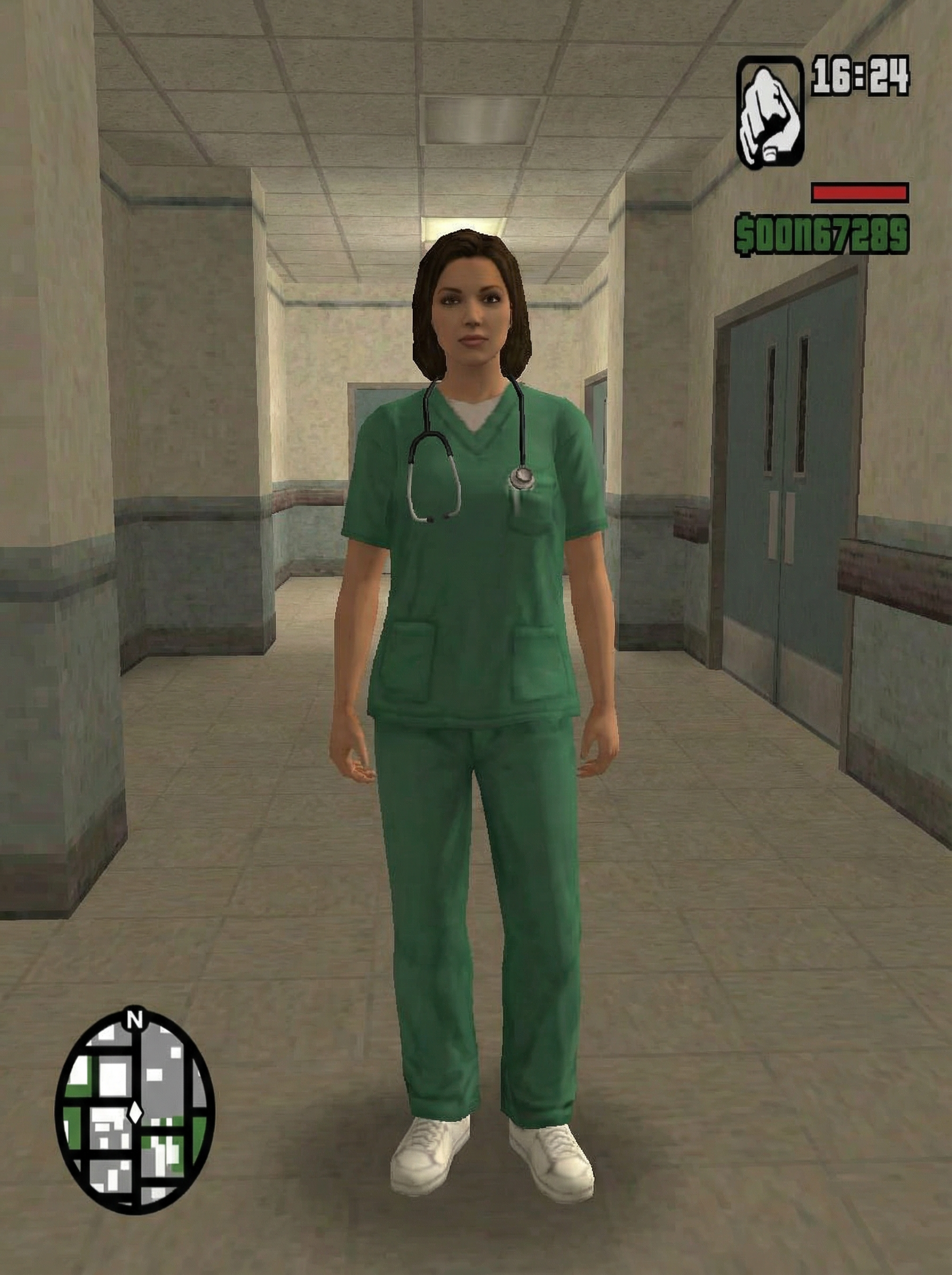 model as character in Grand Theft Auto: San Andreas video game (DO NOT CREATE ILLUSTRATION), in hospital scrubs, wearing medical scrubs, stethoscope, comfortable shoes , entire image is in the style of GTA San Andreas (DO NOT MAKE IT A PHOTO)