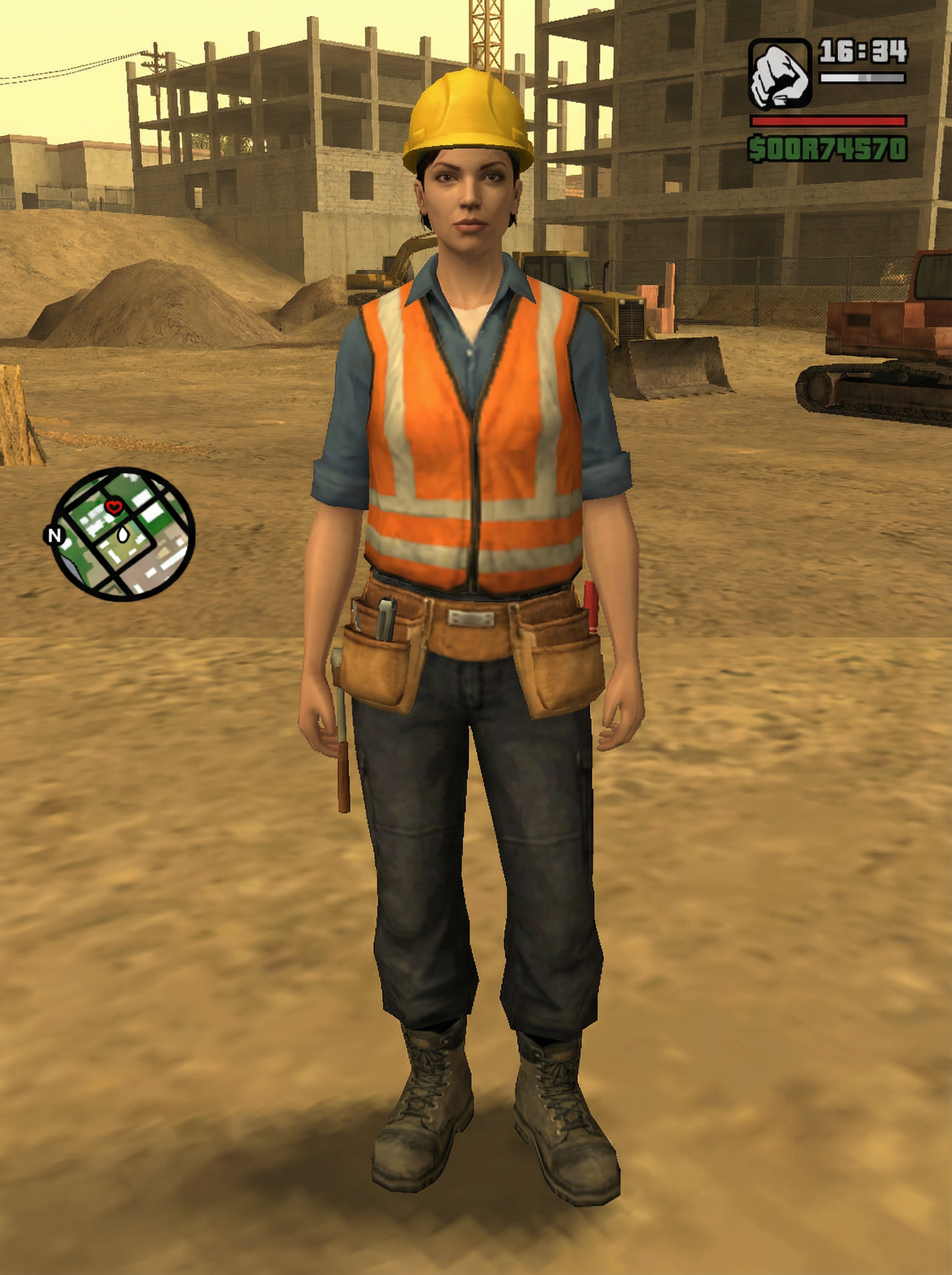 model as character in Grand Theft Auto: San Andreas video game (DO NOT CREATE ILLUSTRATION), at construction site, wearing hard hat, safety vest, work boots, tool belt , entire image is in the style of GTA San Andreas (DO NOT MAKE IT A PHOTO)