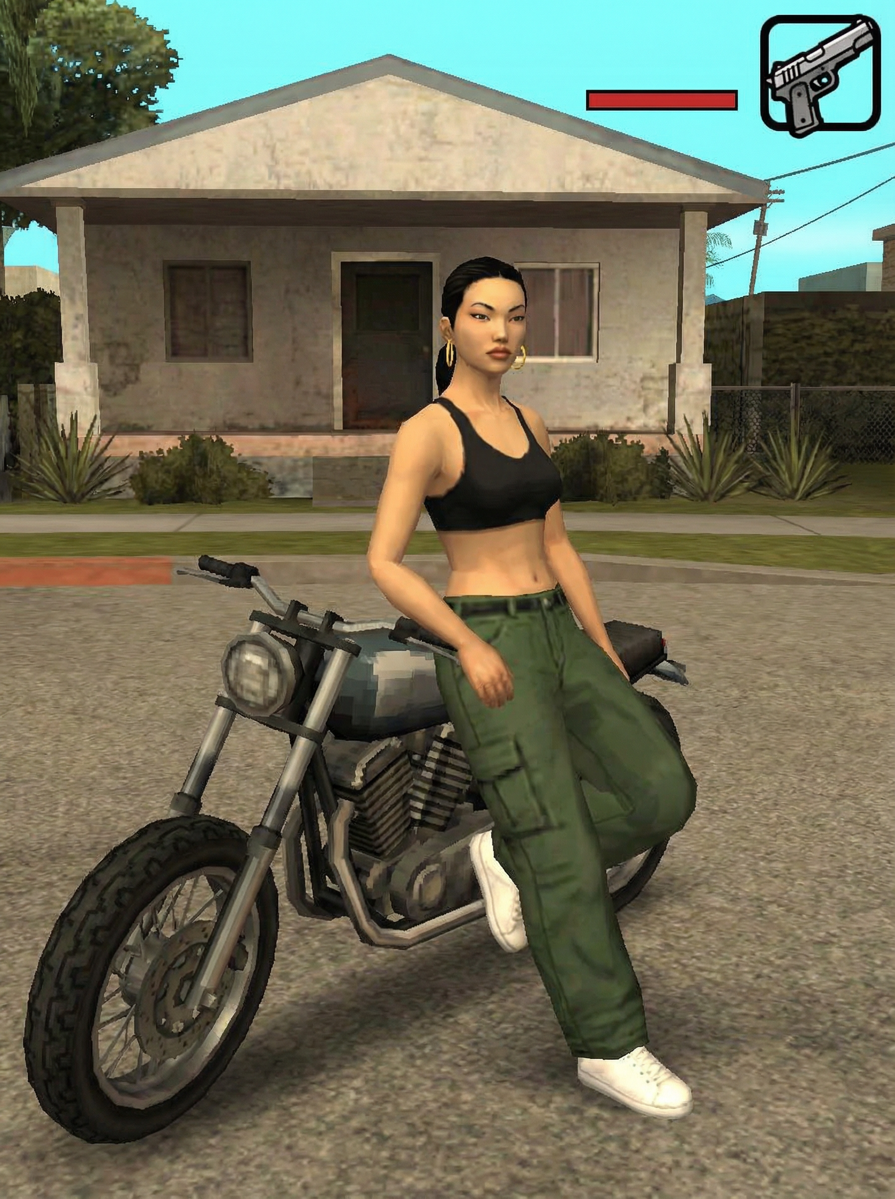 model as character in Grand Theft Auto: San Andreas video game (DO NOT CREATE ILLUSTRATION), leaning against motorcycle outside Grove Street house, wearing sports bra, cargo pants, sneakers, hoop earrings , entire image is in the style of GTA San Andreas (DO NOT MAKE IT A PHOTO)
