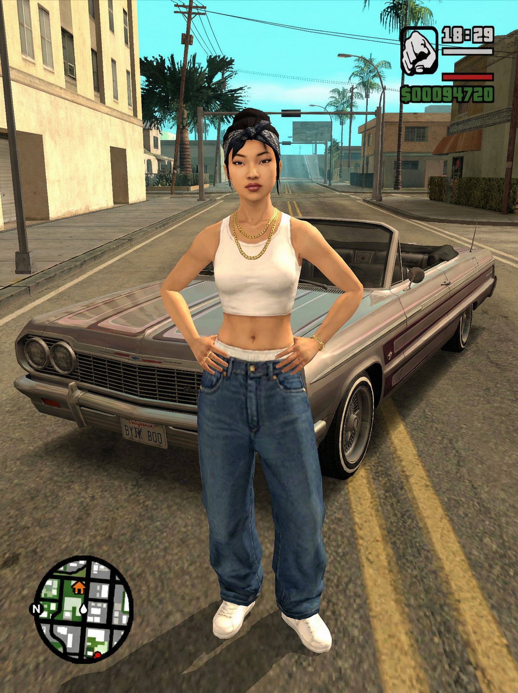 model as character in Grand Theft Auto: San Andreas video game (DO NOT CREATE ILLUSTRATION), standing confidently in front of lowrider car in urban Los Santos street, wearing crop top, baggy jeans, gold chains, bandana , entire image is in the style of GTA San Andreas (DO NOT MAKE IT A PHOTO)