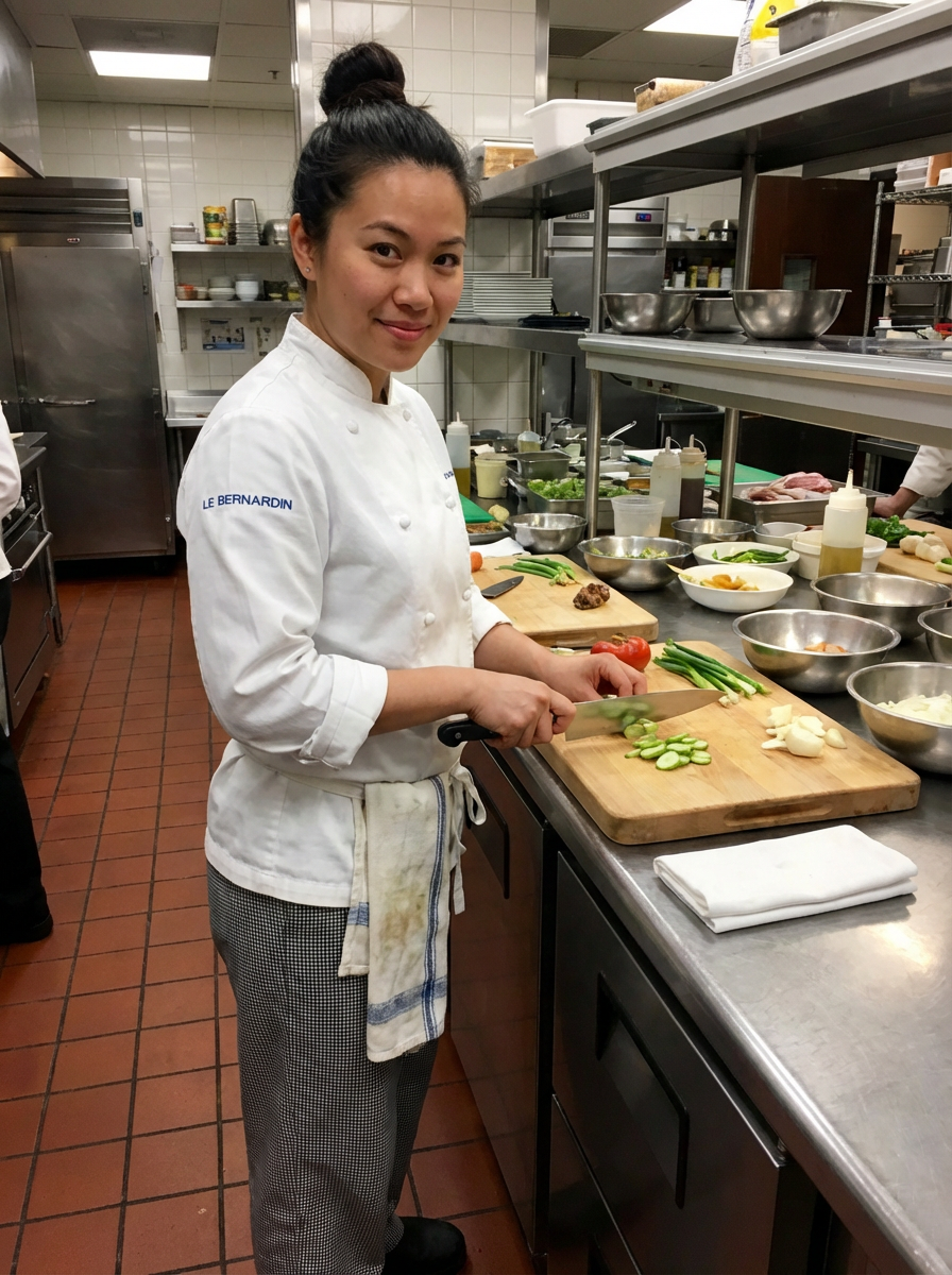model as chef with knife skills pose, holding chefs knife professionally, clean prep station background