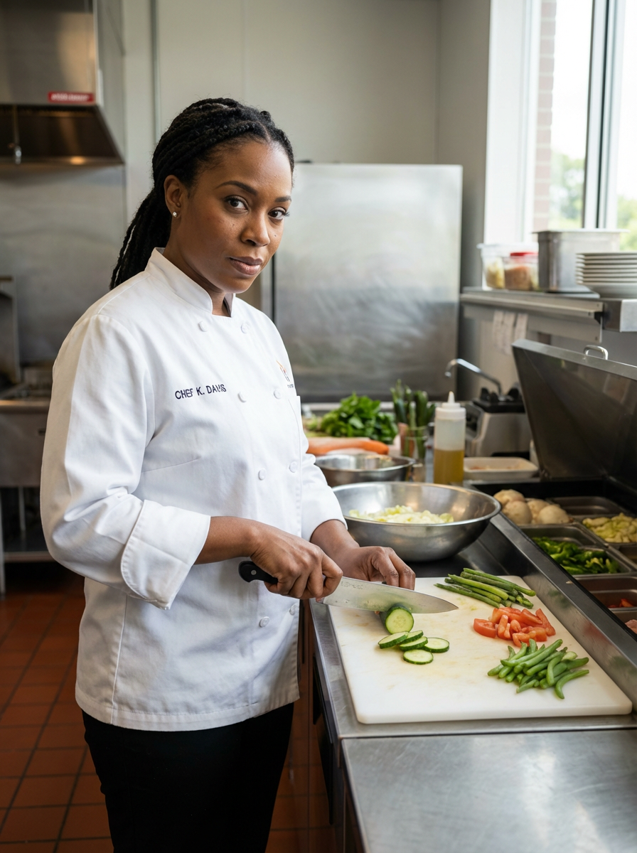 model as chef with knife skills pose, holding chefs knife professionally, clean prep station background