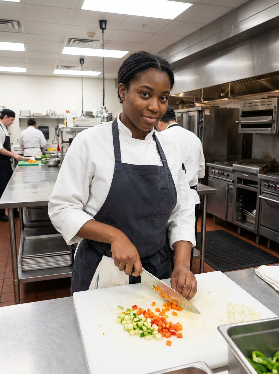 model as chef with knife skills pose, holding chefs knife professionally, clean prep station background