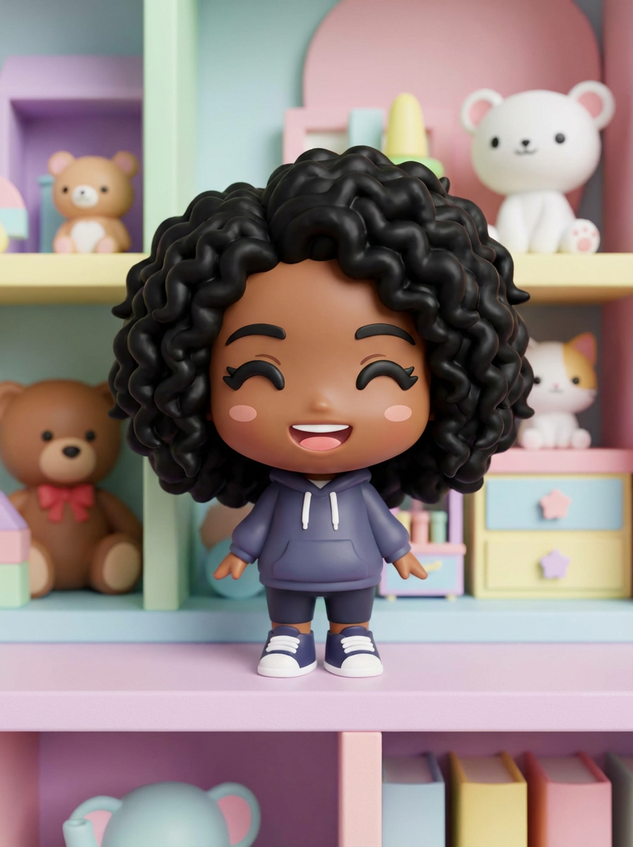 model as chibi character, super deformed cute style, oversized head, tiny body, adorable expression