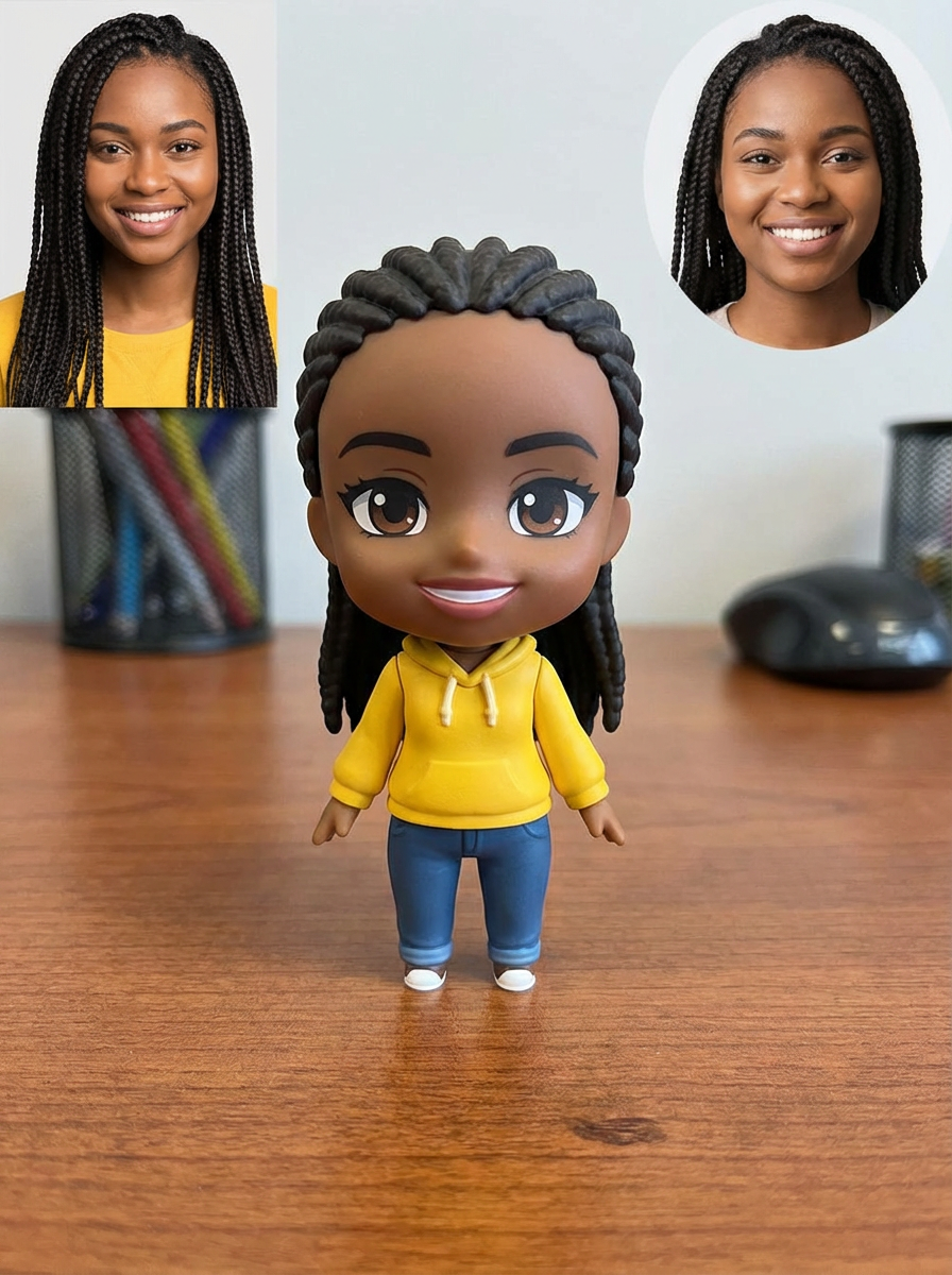 model as chibi character, super deformed cute style, oversized head, tiny body, adorable expression