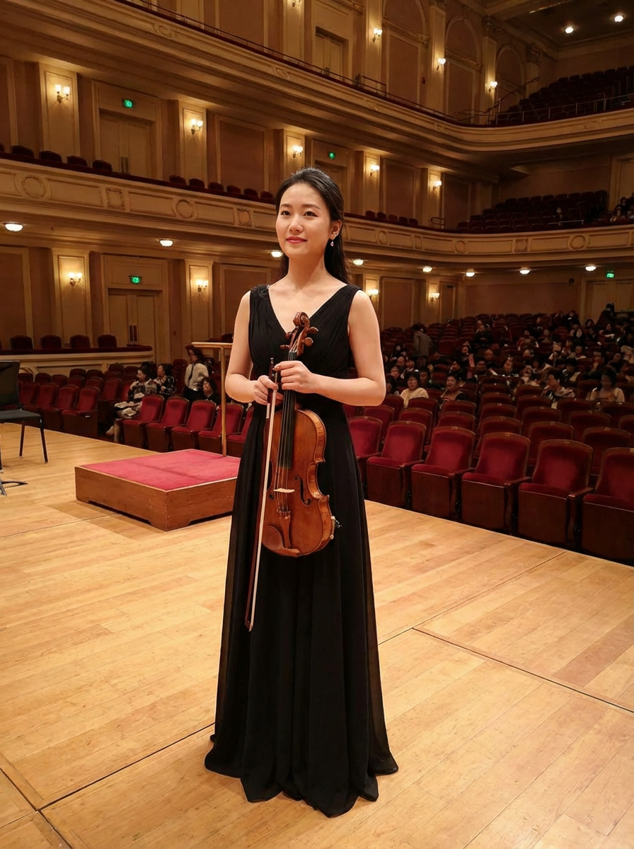 model as classical musician, formal concert attire, elegant sophisticated pose, concert hall background